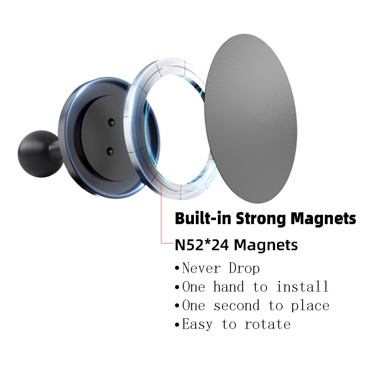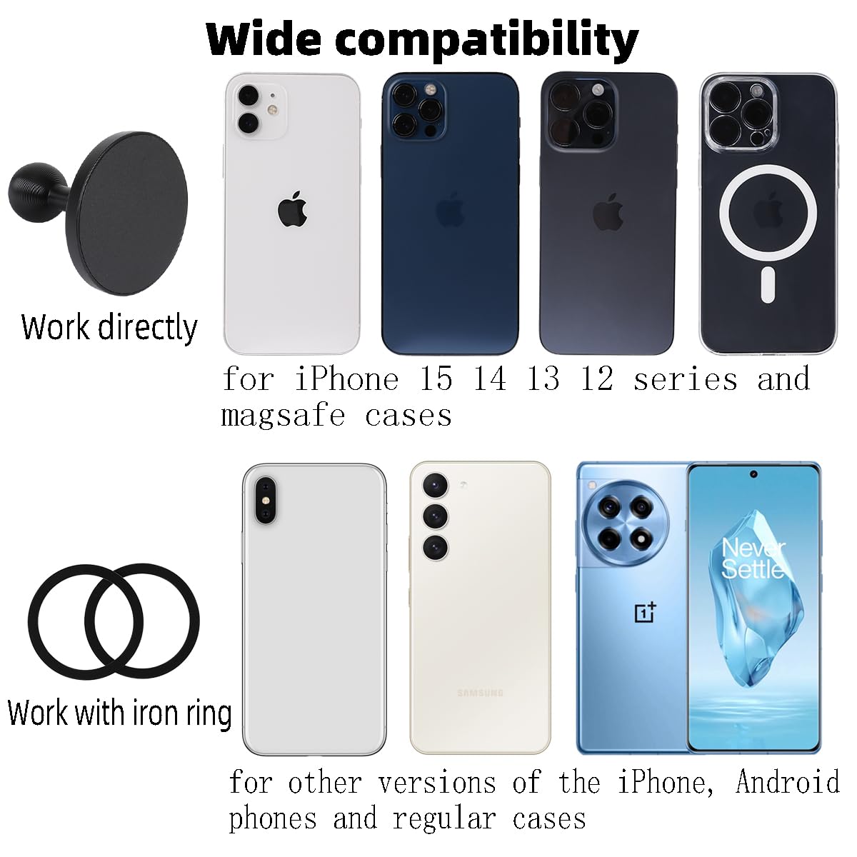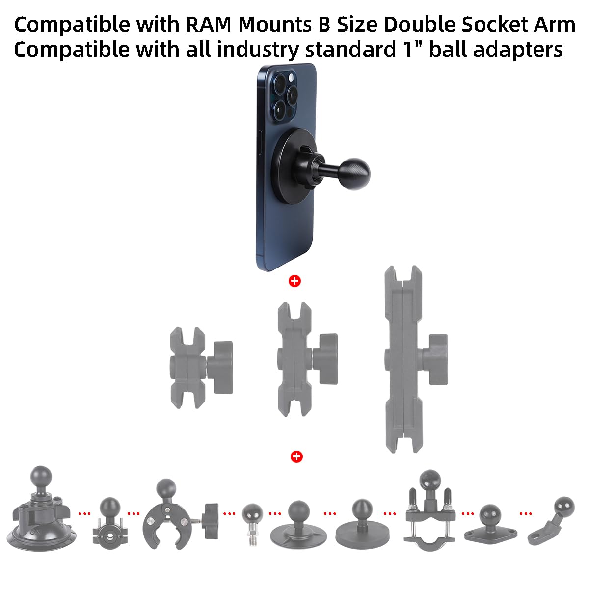 Most MagSafe magnetic phone holders or mounts have weak magnets, I scrolled through Amazon looking for something good and most of the other brands has reviews on weak magnets, when I came to this Super Magnetic cell phone holder it has numerous great reviews on how strong the magnet is which prompted me to purchase one and give it a test, I tested it in a very rough riding company truck integrated with my existing RAM Mount system I already had in the truck, wholly behold the phone never budged or moved, so now I am convinced how strong the magnet is with this holder and I use it at home in the shower to hold my phone and have my phone connected to my Bluetooth speaker outside of the shower and listen to some tunes, I’m definitely getting a couple more and I highly recommend this holder, keep in mind that the 1” ball is slightly smaller than the actual RAM Mount 1” ball but it’s holding in the RAM Mount arms quite well, I do like the fact that it has a 17mm to 1” ball adapter which adds a bit more flexibility.