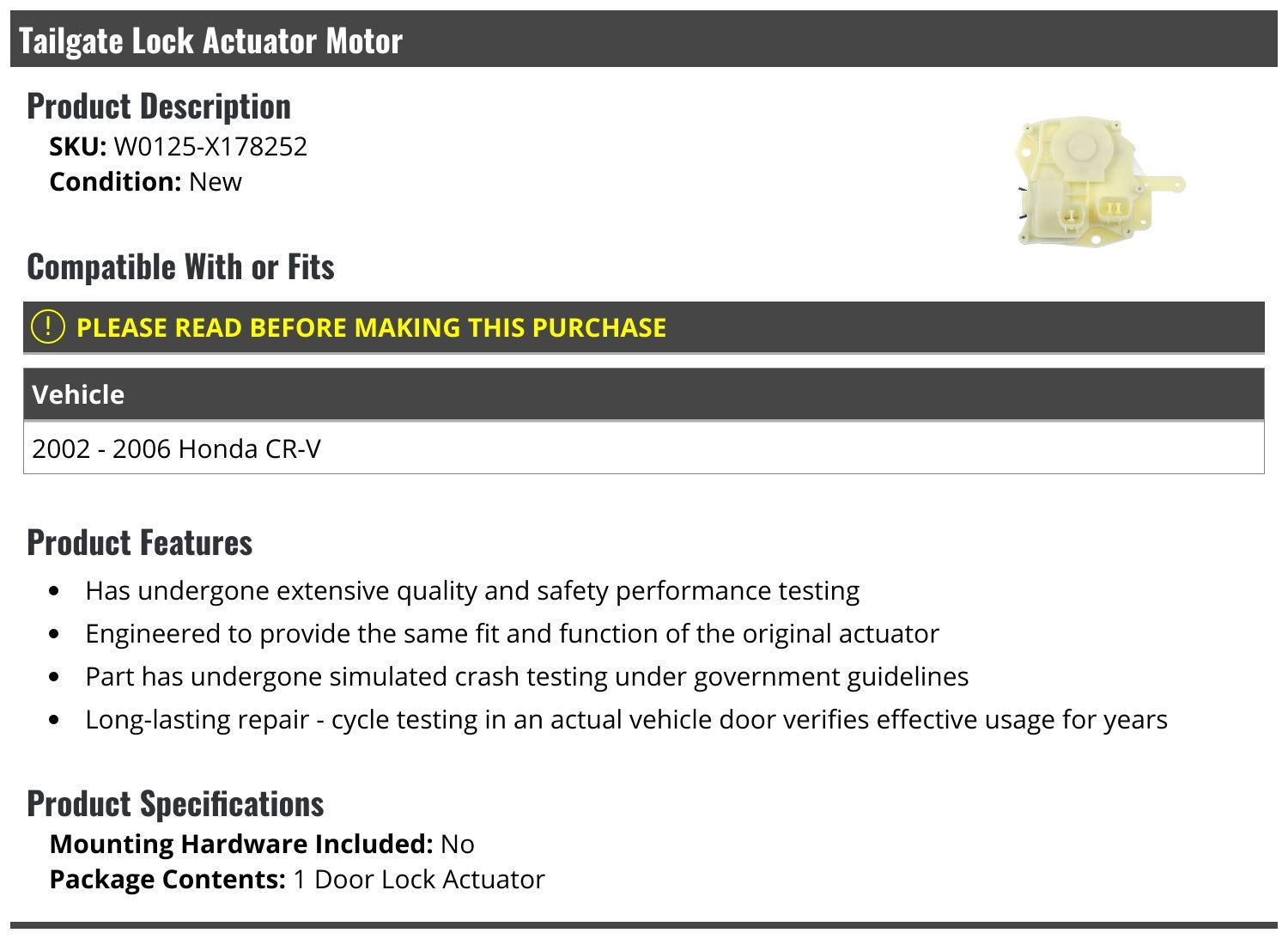 Compré este actuador para puerta trasera de mi Honda CR-V 2005 y funcionó perfecto, lo recomiendo.