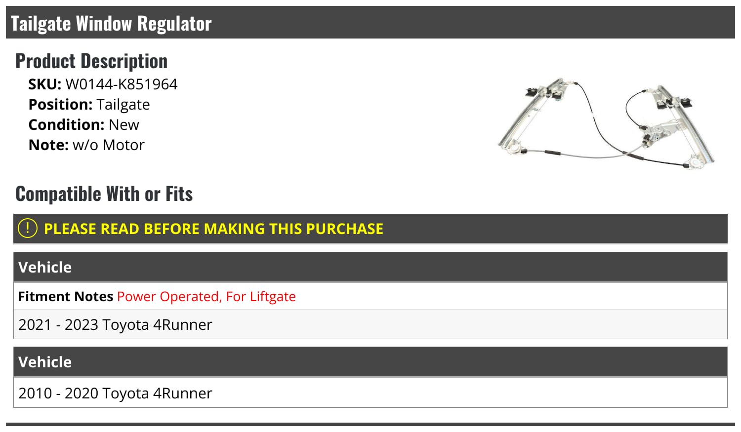 Regulador de Janela de Porta-Malas – Compatível com Toyota 4Runner 2010-2023 (Elétrico, Para Porta-Traseira)