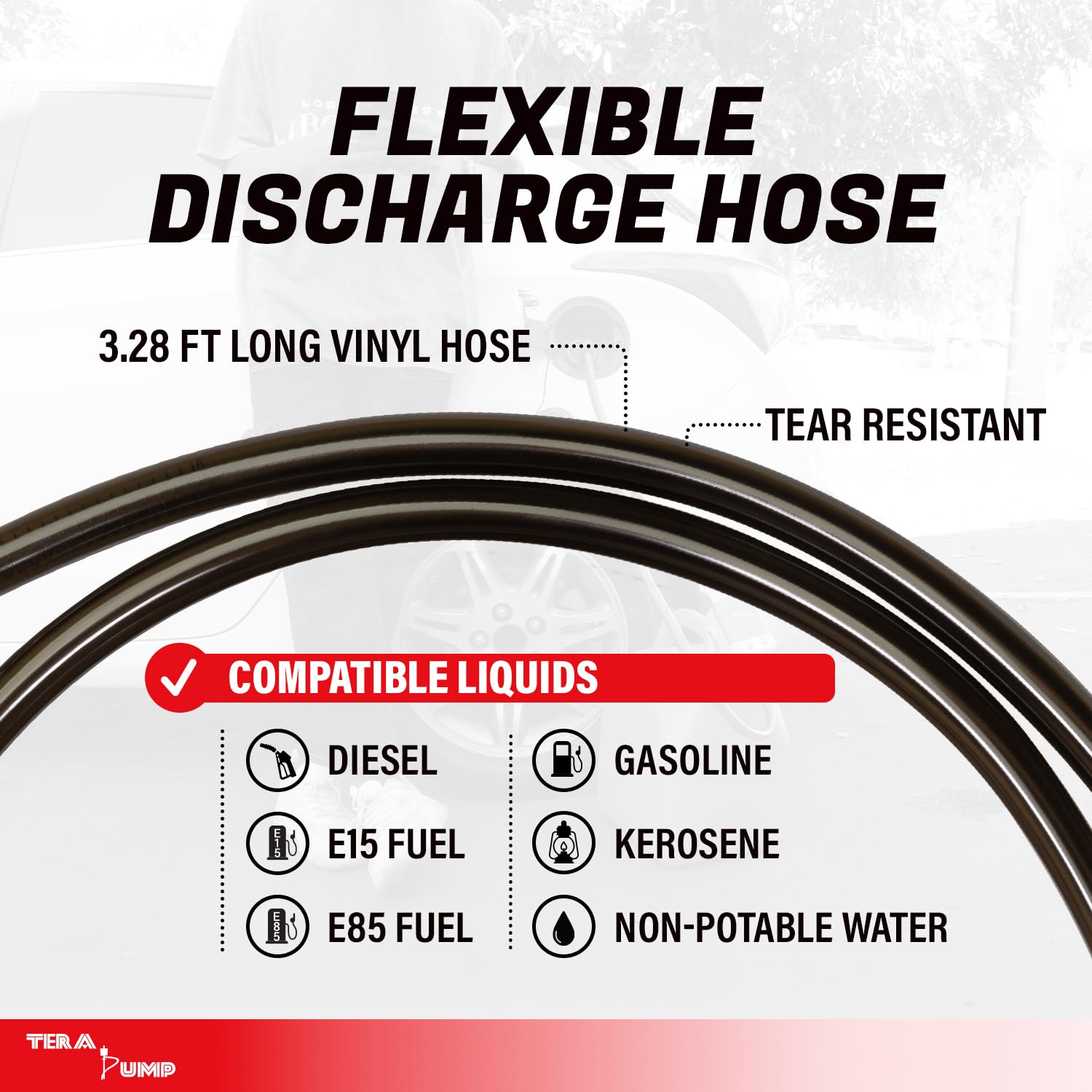 – [ NOVO E MELHORADO ] A bomba conta com um adaptador universal embutido que se encaixa na maioria dos galões e jarras de gasolina de 3 a 5 galões. A mangueira de vinil pesada oferece resistência superior a cortes e danos, enquanto a carcaça do impulsor em metal proporciona proteção adicional contra quedas acidentais. O bico ergonômico foi projetado para máximo conforto e facilidade de uso.