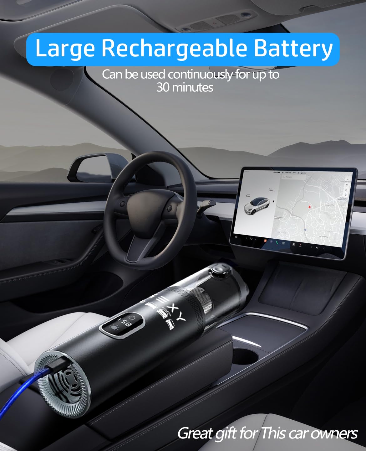 This handheld cordless vacuum works great. I really like the fancy look and it matches perfectly with my Tesla. It’s compact but with very powerful suction. Battery lasts long and very easy to clean.