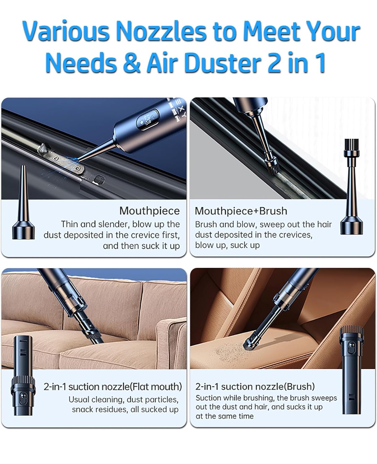 Este aspirador 4 em 1 é versátil e atende a diversas necessidades de limpeza. Com quatro bicos universais, ele é perfeito para tarefas de limpeza no carro, em casa ou até mesmo em atividades ao ar livre. O kit de limpeza para assentos inclui um acessório de escova que ajuda a remover manchas difíceis e sujeira em locais de difícil acesso.