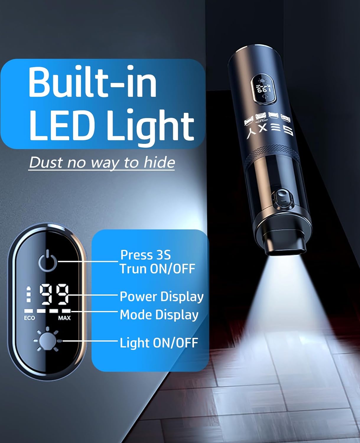 O aspirador conta com uma tela digital que exibe intuitivamente a carga da bateria e o modo de uso selecionado, proporcionando uma experiência de uso mais prática. Além disso, as luzes LED integradas oferecem iluminação adicional para áreas de difícil acesso, tornando a limpeza em locais com pouca luz muito mais fácil e eficiente.