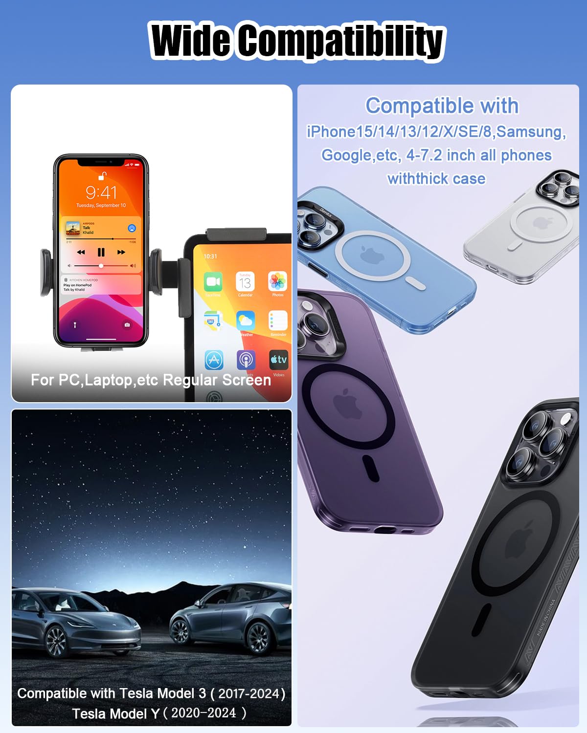 – Compatibilidade Universal: O suporte é compatível com todos os smartphones, incluindo os modelos mais recentes da Apple, como iPhone 16, 15, 14, 13 e 12, além de outros dispositivos com tamanhos de tela entre 4 e 7,2 polegadas.