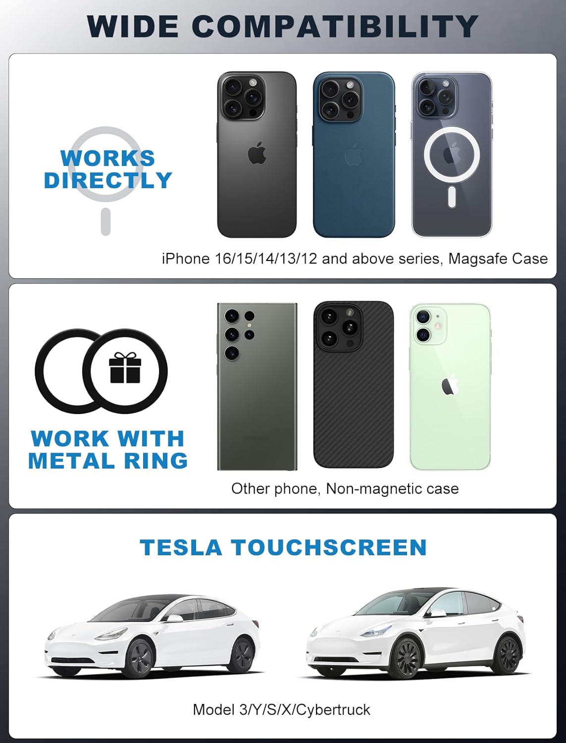 Este suporte para telefone Tesla é compatível com todos os modelos de smartphones, incluindo os mais recentes iPhones (16/15/14/13/12 e superiores) que possuem a funcionalidade MagSafe. Para dispositivos que não possuem essa tecnologia, como iPhones da série 11 e anteriores, ou outros smartphones, basta utilizar o anel metálico incluído, que deve ser fixado na parte traseira do telefone ou na capa não magnética.