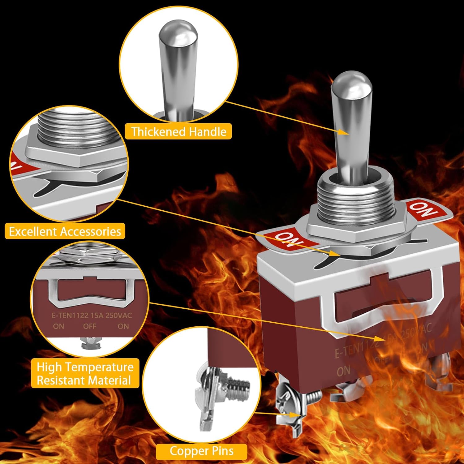 Great toggles. Comes with accessories and they have been working good for multi use projects. Its a toggle switch, all i can say is they hold there rated power consumption with no problem. Ive acceeded the amperes (current) rating and it didnt fail. Unlike some toggles claim to carry certain current and fail at 1/2 the rated current, not with these.
