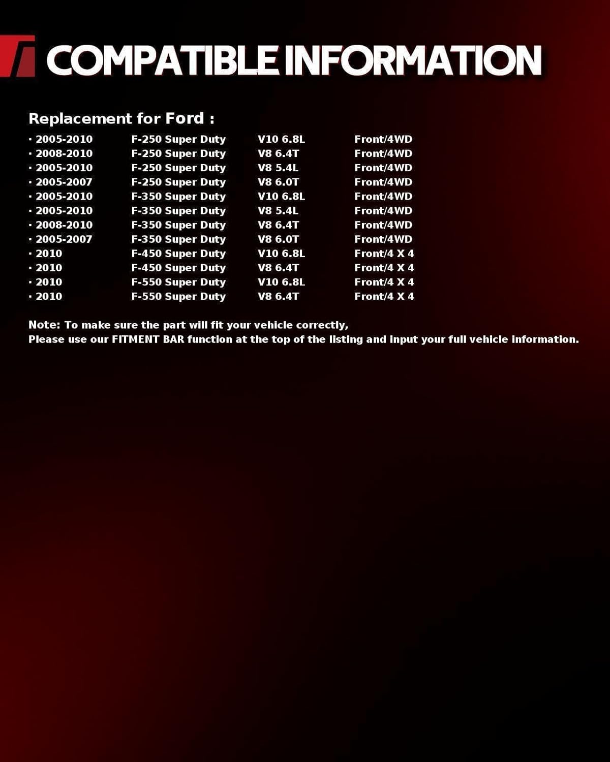 - [Compatibilidade] Assembléias de rolamento de roda compatíveis com Ford F-250 Super Duty 4WD (2005-2010), Ford F-350 Super Duty 4WD (2005-2010), Ford F-450 Super Duty 4 X 4 (2010) e Ford F-550 Super Duty 4 X 4 (2010).