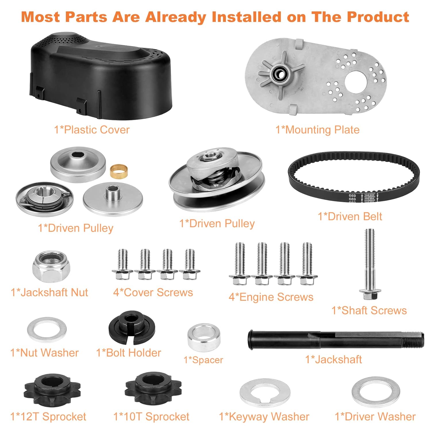 O pacote contém dois dentes de engrenagem: uma engrenagem de 10 dentes para correntes #40, #41 e #420, e uma engrenagem de 12 dentes para corrente #35. O diâmetro total da unidade acionada é de 6” (com polia acionada de 5/8”), e o furo da embreagem do acionador é de 3/4”. Além disso, o kit inclui uma placa de montagem de alumínio, um eixo de jackshaft com engrenagem (corrente não incluída) e um conjunto completo de hardware de montagem.