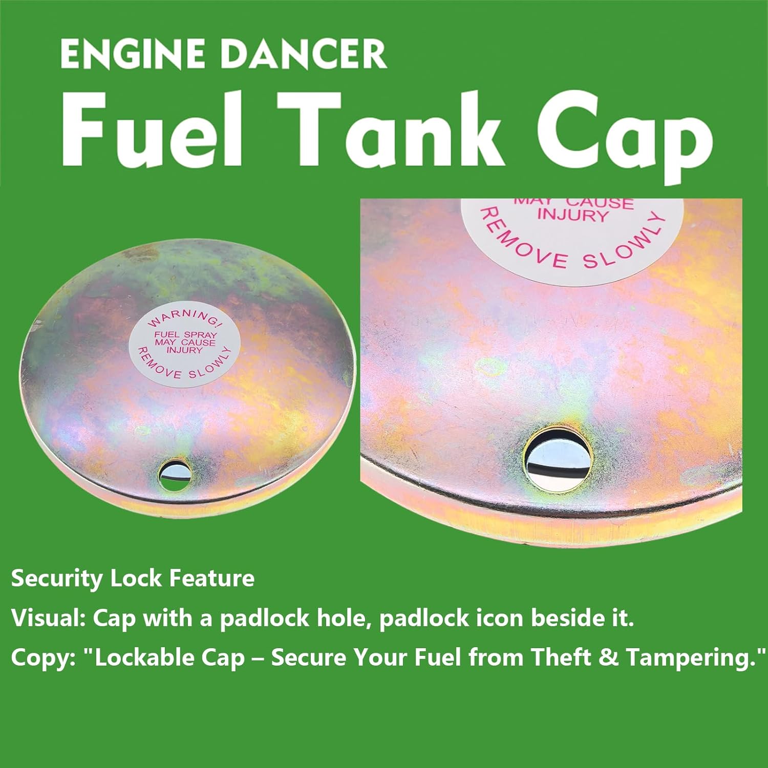 - Design Robusto e Bloqueável: Nossa tampa de tanque de transferência apresenta um design de bloqueio seguro para maior segurança. Ela vem com uma base roscada padrão de 2 polegadas NPT que se fixa firmemente ao seu tanque, sendo compatível com cadeados que possuem diâmetros de gancho de 1/4 a 5/16 polegadas (cadeado não incluído), protegendo seu suprimento de combustível.