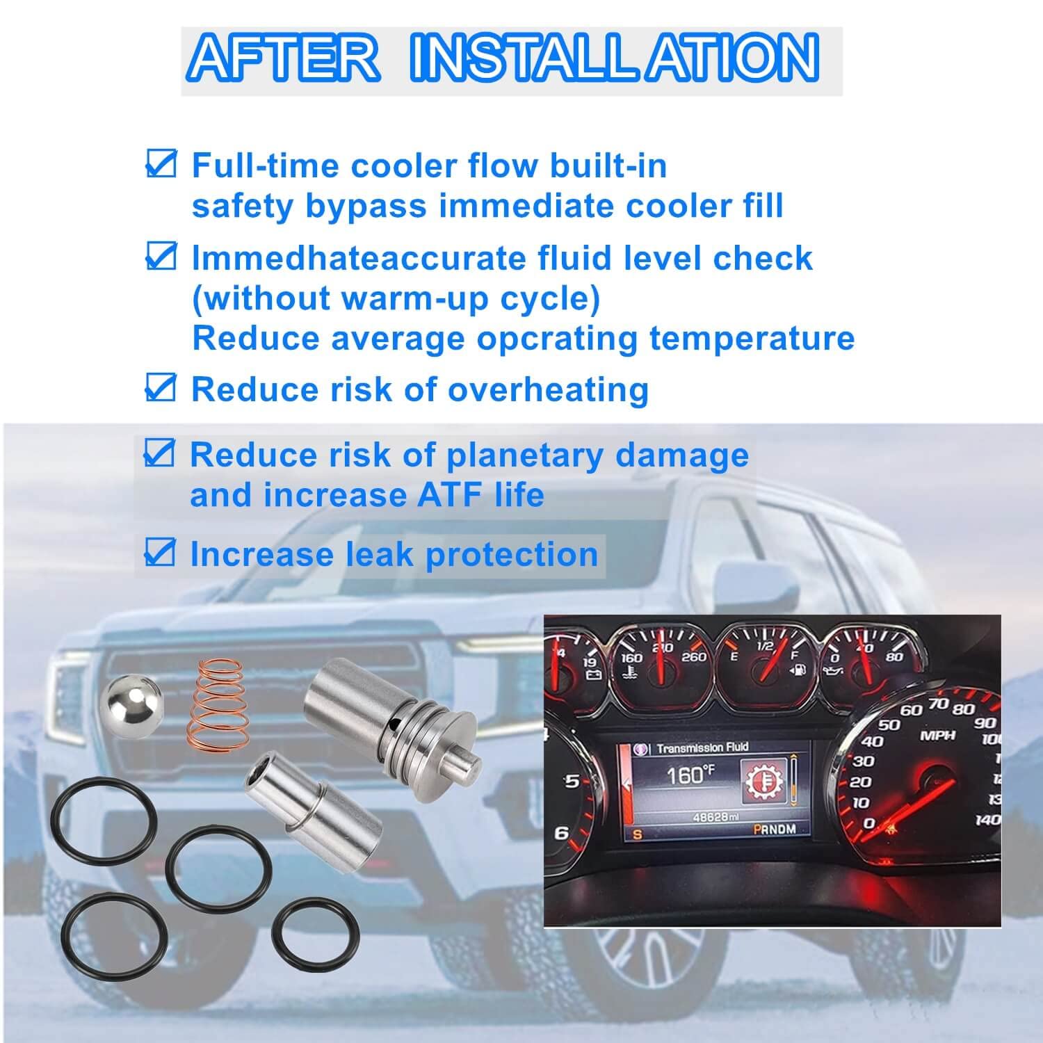 - Desempenho: O kit inclui um bypass de segurança embutido que garante o preenchimento instantâneo do resfriador. Isso permite uma verificação precisa do nível de fluido sem a necessidade de um ciclo de aquecimento, melhorando o desempenho da sua transmissão e aumentando sua confiabilidade e vida útil.