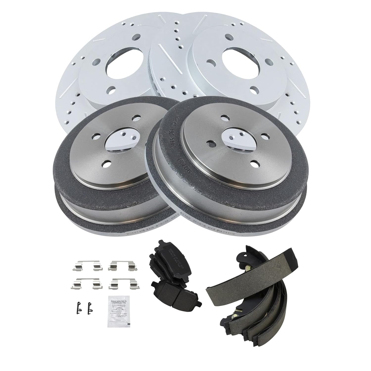 O kit inclui um conjunto de pastilhas de freio cerâmicas para a frente, que vêm acompanhadas de graxa para pontos de contato e hardware, além de um conjunto de sapatas de freio traseiras. Para completar, o pacote contém dois rotores de freio de desempenho para a frente e dois tambores de freio traseiros, proporcionando uma atualização completa do sistema de frenagem do seu veículo.
