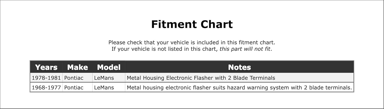 Resposta: Não, este Turn Signal Flasher é especificamente projetado para os modelos Pontiac LeMans de 1968 a 1981. Para outros veículos, recomenda-se verificar as especificações do produto.