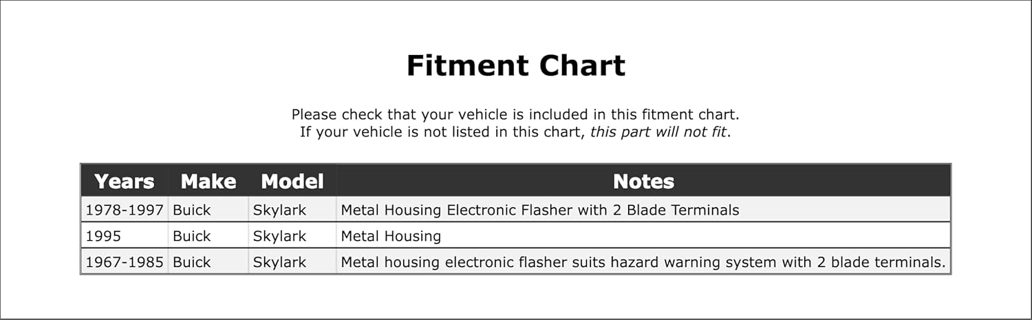 Resposta: Este flasher é projetado para os anos específicos do Buick Skylark. Para outros anos ou modelos, é importante verificar as especificações de compatibilidade.