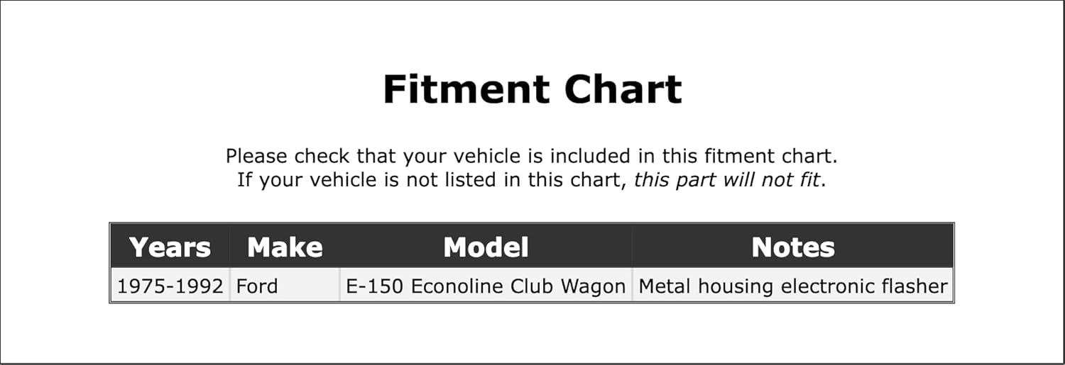 O Flasher de Sinal de Turno compatível com o Ford E-150 Econoline Club Wagon, anos 1975 a 1992, é a solução ideal para quem busca qualidade e desempenho excepcionais em um componente essencial do sistema de sinalização do veículo. Este produto inclui 1 (um) Flasher de Sinal de Turno, projetado especificamente para se encaixar perfeitamente em uma lista de veículos, conforme detalhado na galeria de imagens do gráfico de compatibilidade.