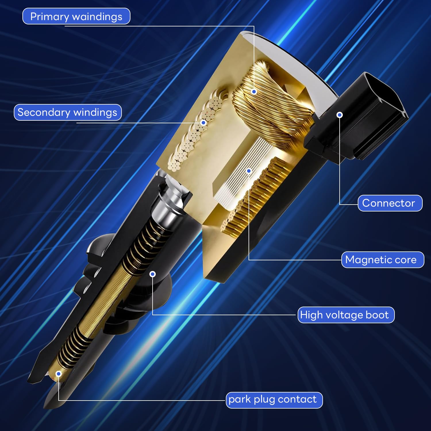 - Resolve problemas comuns do sistema de ignição: As Bobinas de Ignição GAGOLCAR abordam efetivamente problemas comuns, como estalos, falhas de ignição, engasgos, tremores do motor e marcha lenta irregular. Elas também aumentam a potência para otimizar o desempenho geral do motor. Além disso, essas bobinas monitoram as luzes de verificação do motor para falhas de circuito e engasgos severos.