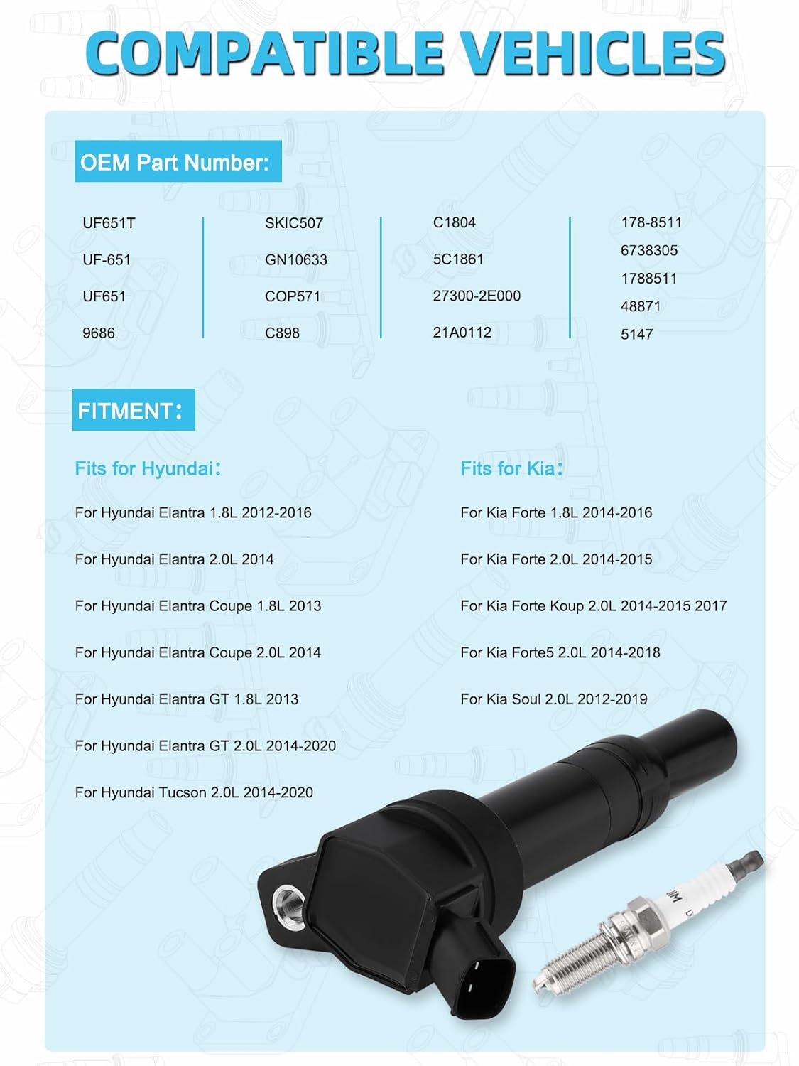 Bobina de Ignição UF651 com Vela de Ignição (apenas para motores 1.8L e 2.0L) para Hyundai Elantra, Tucson, Kia Soul, Forte e Forte5. Este produto oferece desempenho otimizado, melhorando a eficiência do motor e a economia de combustível. A instalação é simples e rápida, garantindo uma substituição eficaz. Com tecnologia avançada, proporciona ignição confiável e durabilidade, reduzindo falhas e aumentando a vida útil do motor. Ideal para quem busca qualidade e desempenho superior em veículos compatíveis.