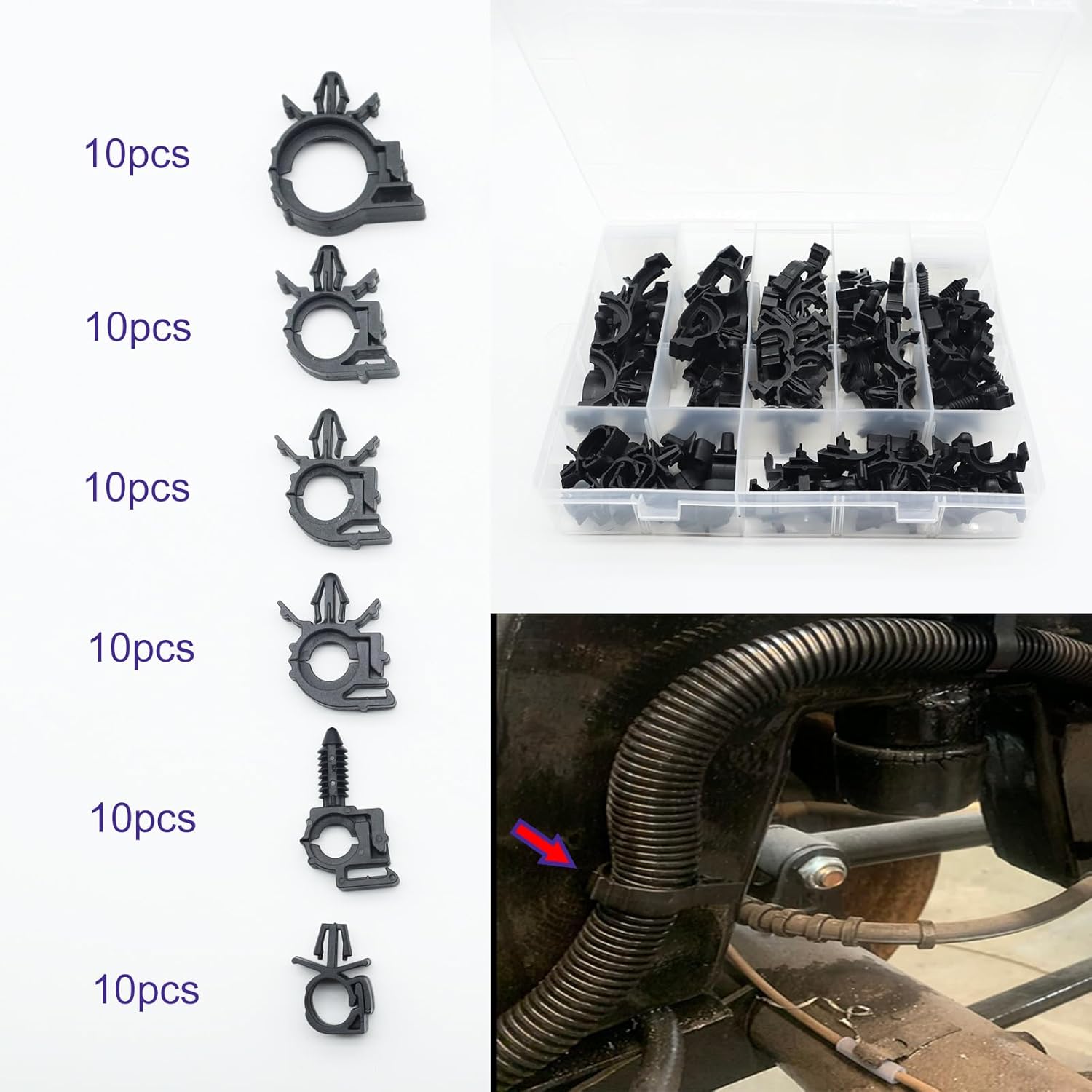 Kit de 50 braçadeiras de cabo com clipes de mangueira automotiva para montagem universal. Ideal para organizar e fixar cabos no compartimento do motor de caminhões e carros. Oferece fácil instalação, durabilidade e resistência a altas temperaturas, garantindo uma solução prática e eficiente para manutenção automotiva. Perfeito para quem busca um acabamento limpo e seguro na fiação do veículo.
