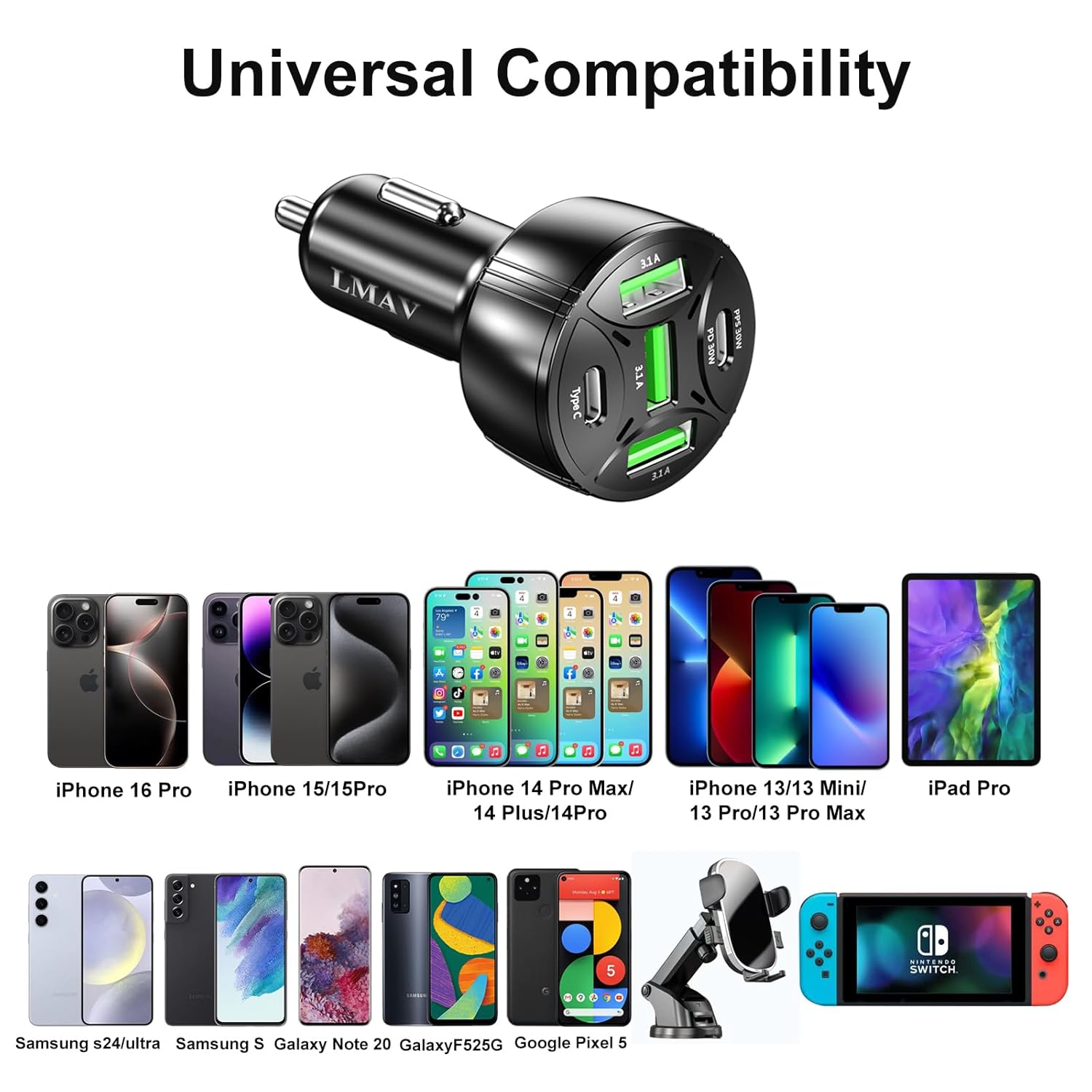 Este carregador é compatível com todos os dispositivos que utilizam USB, incluindo iPhones das séries 16, 15, 14, 13, 12, 11 Pro Max, iPads Pro e dispositivos Android como Samsung Galaxy S24, S23, S22, S21, Note 20, entre outros. Projetado para se encaixar em qualquer slot de adaptador de isqueiro de 12V/24V, ele é ideal para carros, ônibus, caminhões, pickups e vans.