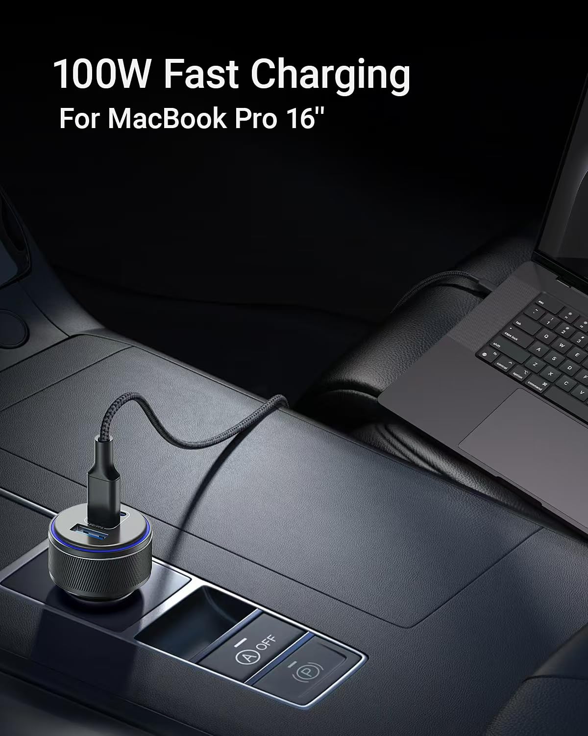 O adaptador de carregamento rápido para carro permite carregar até três dispositivos simultaneamente, tornando-o perfeito para viagens em família ou para quem precisa manter vários gadgets carregados. A porta USB-C1, com sua impressionante capacidade de 100W, é ideal para carregar rapidamente seu MacBook Pro de 16 polegadas e outros dispositivos, alcançando até 45% de carga em apenas 30 minutos.
