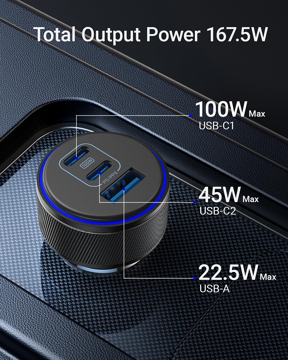 Experimente um carregamento rápido e eficiente com o Carregador Veicular USB-C, projetado especialmente para atender às necessidades dos usuários de dispositivos modernos. Com uma potência máxima de 167,5W e três portas de carregamento, este adaptador é a solução ideal para quem precisa de energia enquanto está em movimento. O carregador possui uma porta C1 que oferece até 100W de potência, uma porta C2 com até 45W e uma porta A que garante a compatibilidade com uma ampla gama de dispositivos.