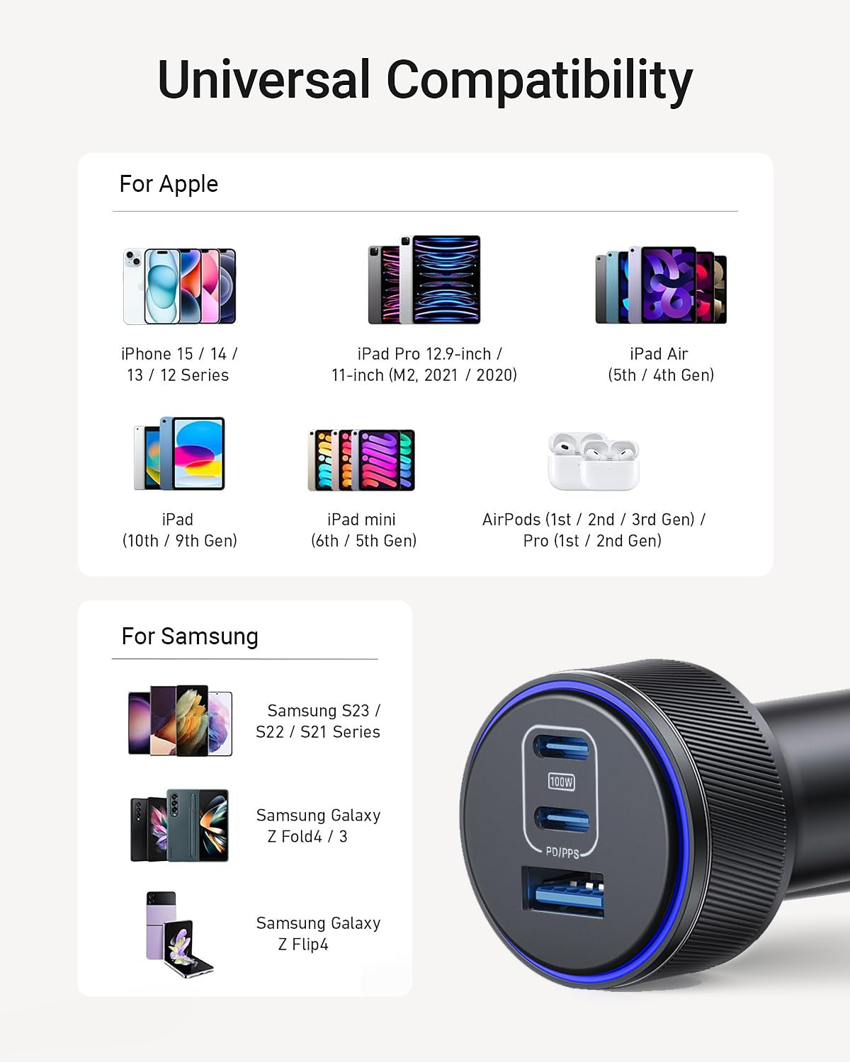 O adaptador de carregamento rápido para carro permite carregar até três dispositivos simultaneamente, tornando-o perfeito para viagens em família ou para quem precisa manter vários gadgets carregados. A porta USB-C1, com sua impressionante capacidade de 100W, é ideal para carregar rapidamente seu MacBook Pro de 16 polegadas e outros dispositivos, alcançando até 45% de carga em apenas 30 minutos.