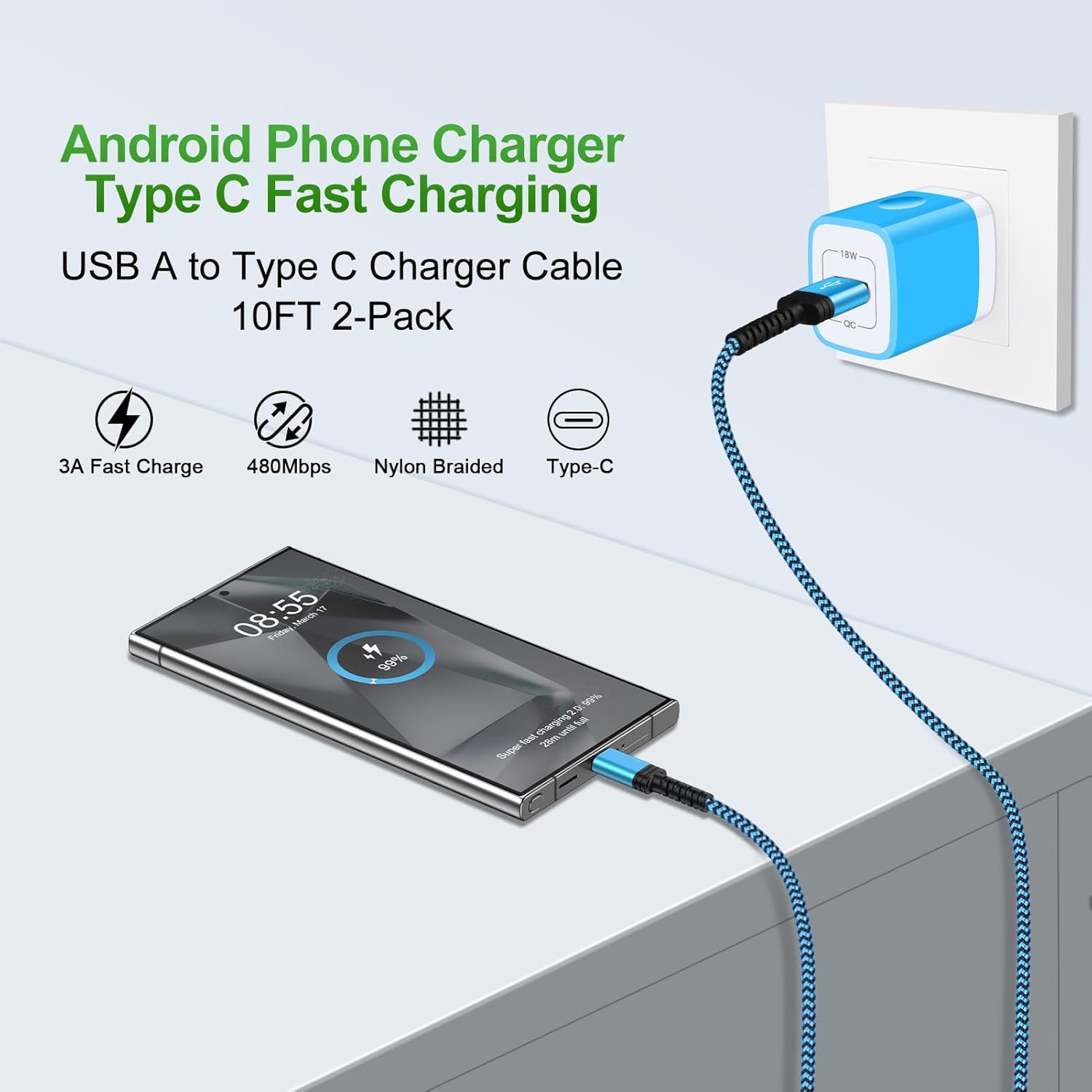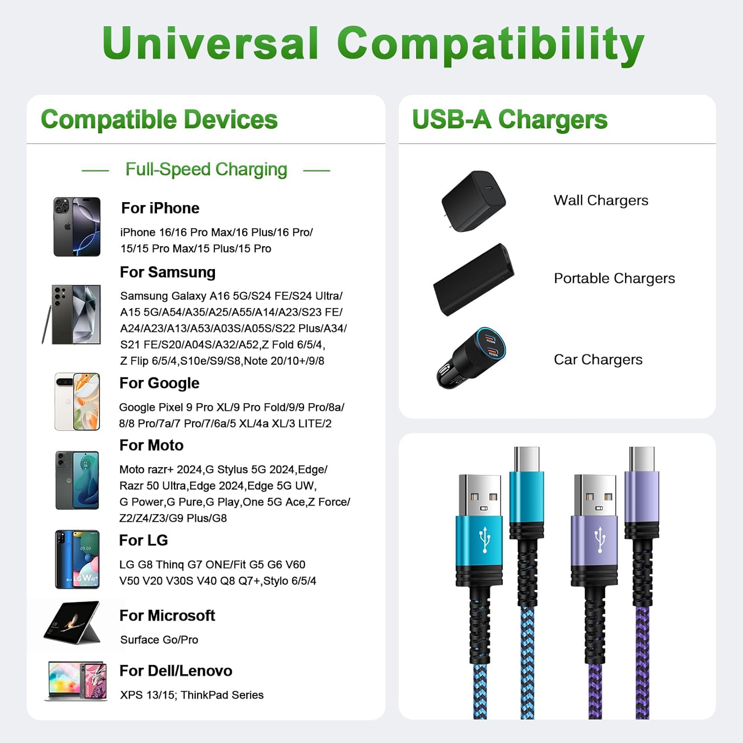 O Cabo de Carregamento USB C Rápido de 10FT (2 Pacotes) é a solução ideal para quem busca eficiência e praticidade no carregamento de dispositivos. Compatível com uma ampla gama de smartphones, incluindo os mais recentes iPhones 16, 16 Pro Max, 16 Plus, 16 Pro, 15, 15 Plus e 15 Pro Max, além de dispositivos Samsung como Galaxy S24 FE, S24 Ultra, A16 5G, A25, A15 5G, e muitos outros, este cabo é projetado para atender às necessidades de todos os usuários.