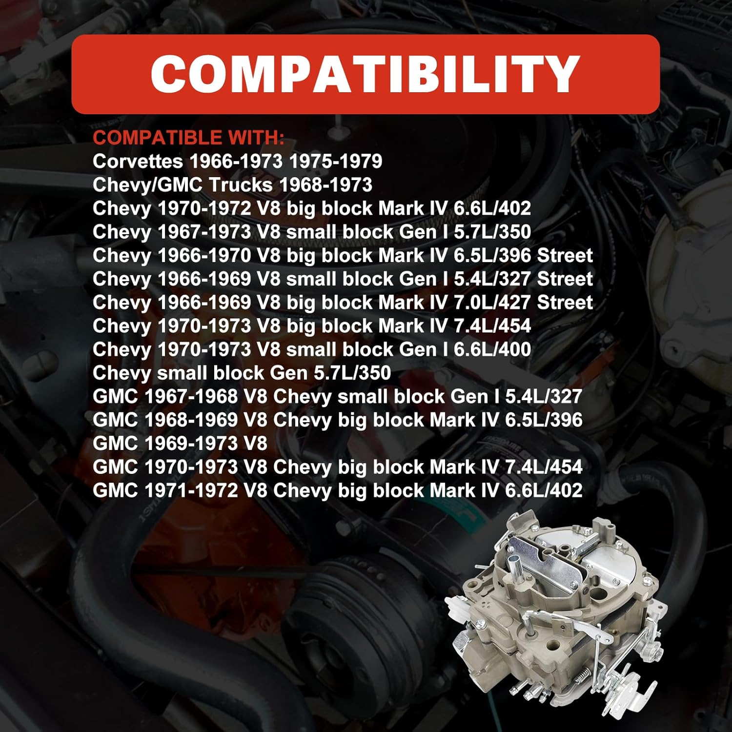 – Chevy V8 Big Block Mark IV: 6.6L/402 (1970-1972), 6.5L/396 (1966-1970), 7.0L/427 (1966-1969), 7.4L/454 (1970-1973)