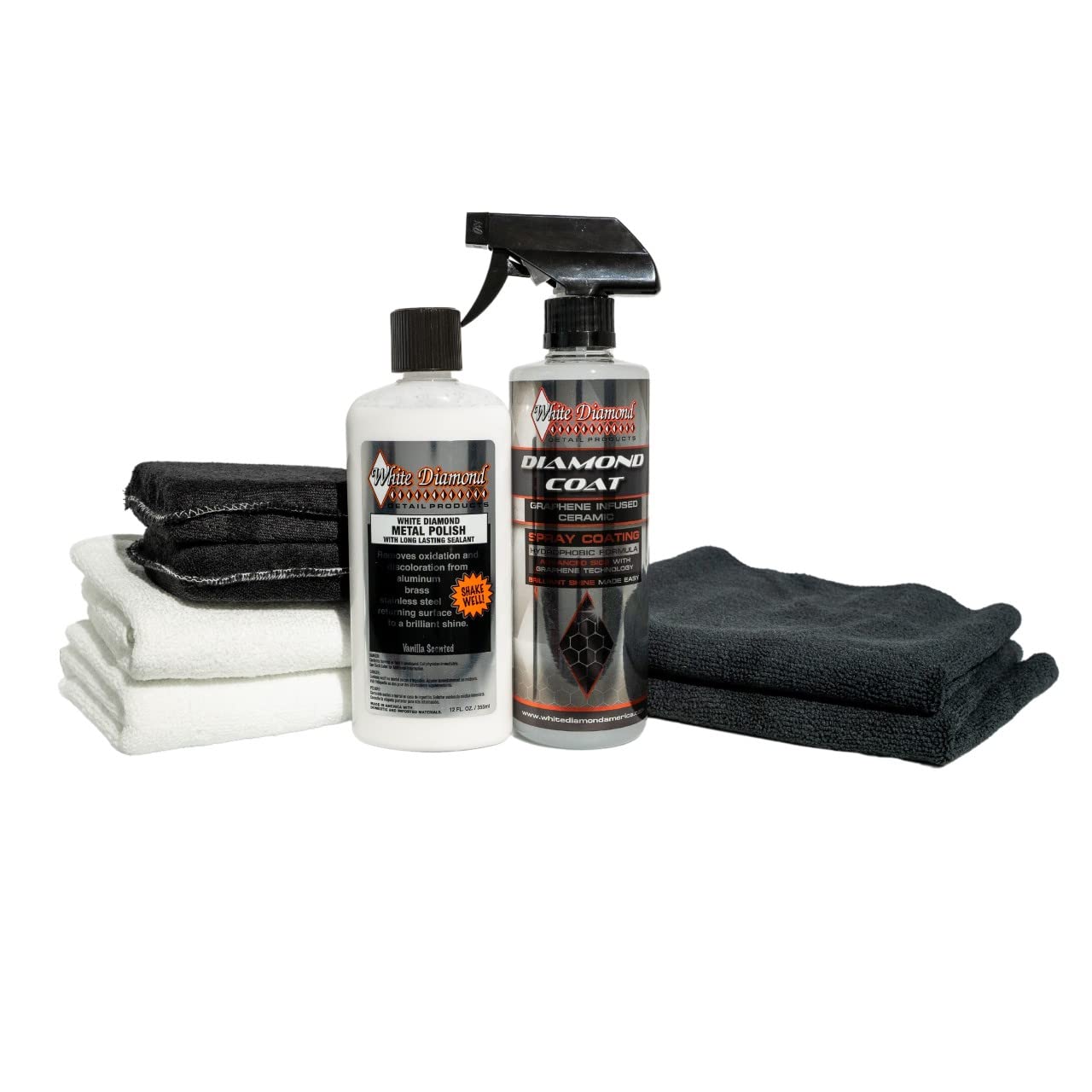 This diamond ceramic coating produces a shiny, hard, and water proof finish. It as easy to apply. The white diamond metal cleaner does a great job. It is simple to use and cleans up rusty spots. It also does an outstanding job cleaning and polishing dining silverware. The polishing pack comes with two applicator pads and four towels.