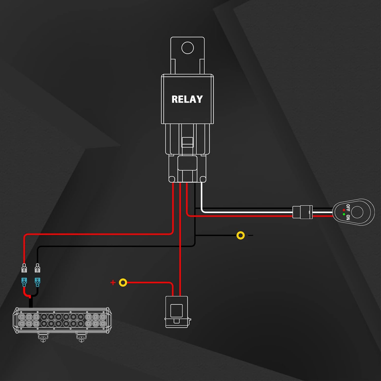- Alto Desempenho: O relé de potência de 40A e o fusível de lâmina inline oferecem múltiplas proteções de segurança, assegurando que sua instalação permaneça segura e eficiente. O kit possui uma saída de conexão para uma barra de luz LED off-road pesada acima de 180W.
