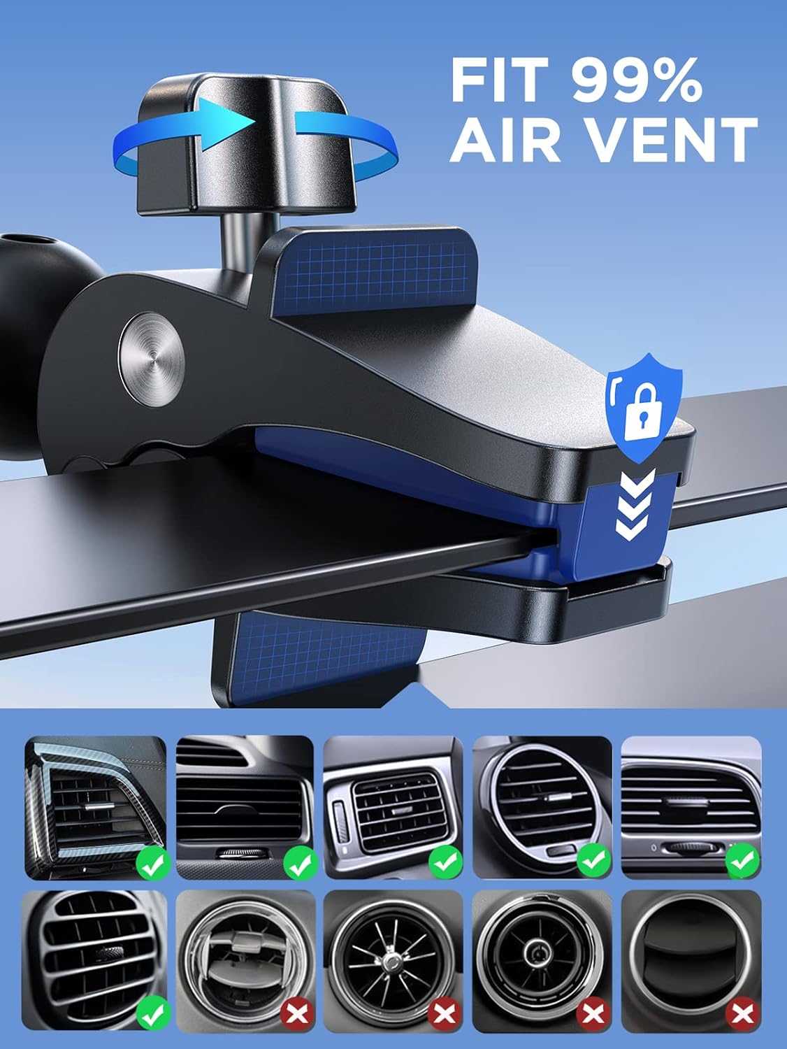 O clipe de ventilação anti-chacoalhar foi aprimorado em 2024, oferecendo maior compatibilidade e se ajustando perfeitamente a 99% das saídas de ar, tanto na vertical quanto na horizontal. Com um design triangular de fixação, você não precisará mais se preocupar com o seu celular balançando ou caindo em estradas irregulares ou trilhos de trem.