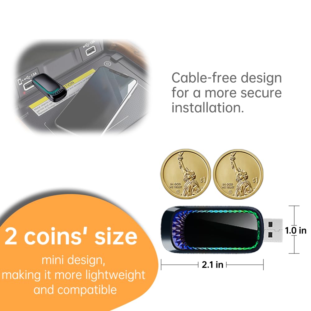 – Luzes LED: O adaptador possui uma iluminação ambiente projetada para ser tão vibrante quanto as asas de um beija-flor, adicionando um toque de estilo ao interior do seu carro.