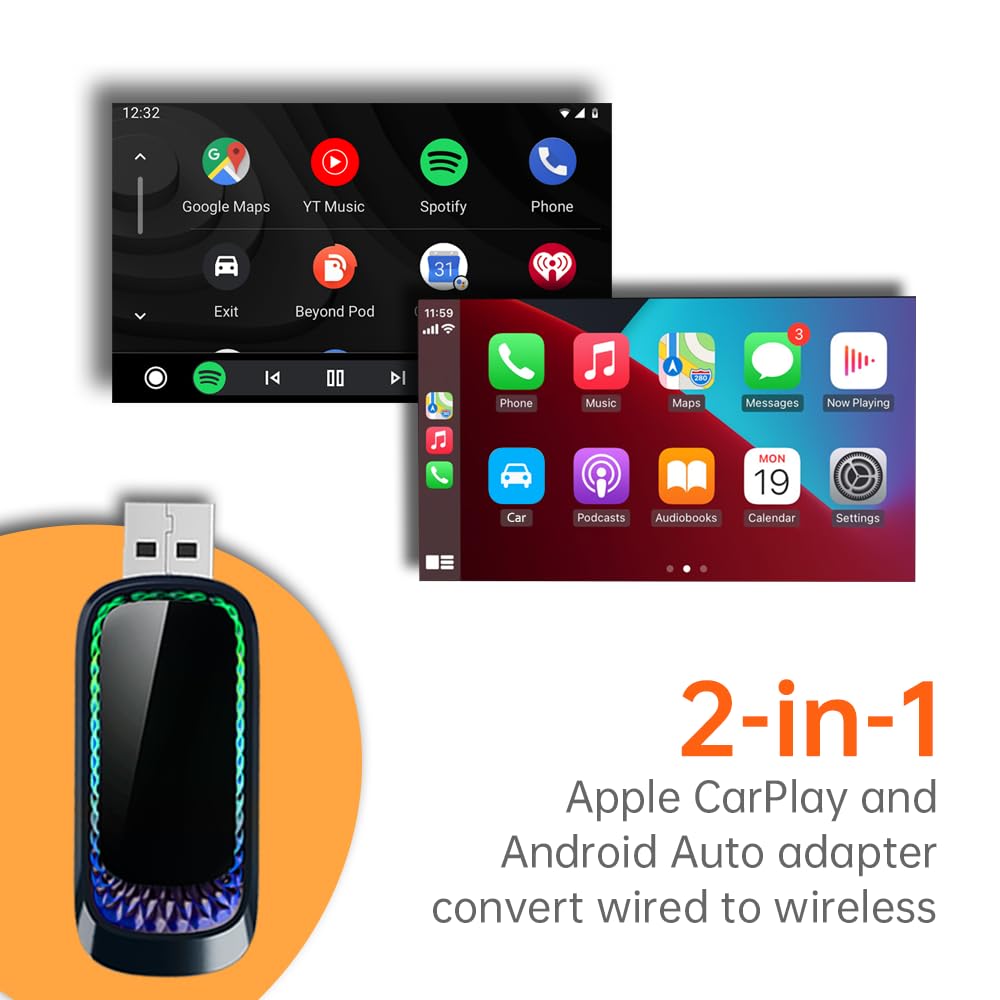 – Adaptador 2 em 1 Wireless: Suporta tanto Apple CarPlay quanto Android Auto, permitindo que usuários de ambos os sistemas operacionais desfrutem de uma experiência sem fio.