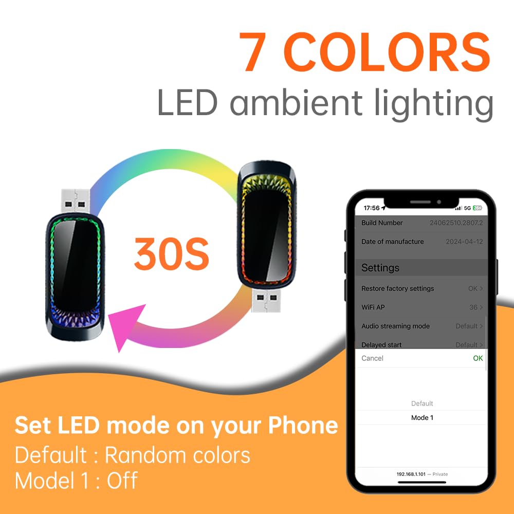 – Iluminação Ambiente de 7 Cores: O adaptador apresenta sete cores de LED que mudam aleatoriamente a cada 30 segundos, criando uma atmosfera única dentro do veículo. O modo de luz pode ser ativado ou desativado conforme sua preferência.