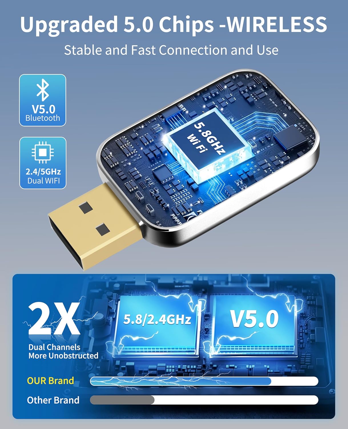 Descubra a liberdade de dirigir sem fios com o Adaptador Wireless CarPlay para iPhone – Upgrade 2025 2 em 1 CarPlay. Este dispositivo inovador transforma a experiência de condução, permitindo que você acesse todas as funcionalidades do CarPlay e Android Auto de forma rápida e eficiente. Com um chip de última geração versão 5.0, este adaptador é equipado com Bluetooth 5.0 e WIFI de 5.8GHz/2.4GHz, garantindo uma conexão estável e sem atrasos. A configuração inicial é simples e rápida, levando apenas 10 segundos para conectar e reconectar automaticamente em 5 segundos, permitindo que você se concentre no que realmente importa: a estrada.