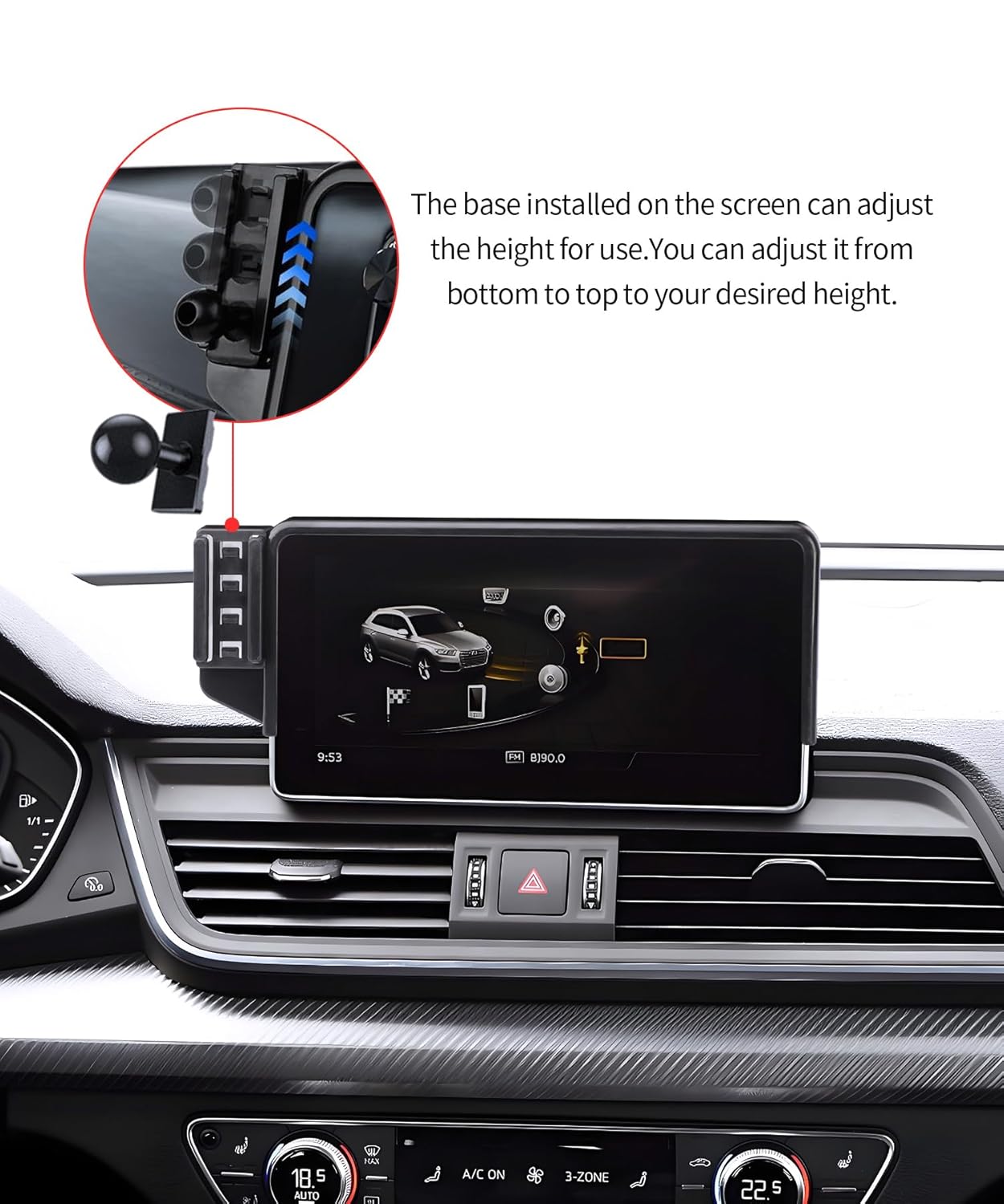 1. Instalação: Fixe o suporte na tela de controle central do seu Audi, garantindo que esteja bem preso e alinhado.