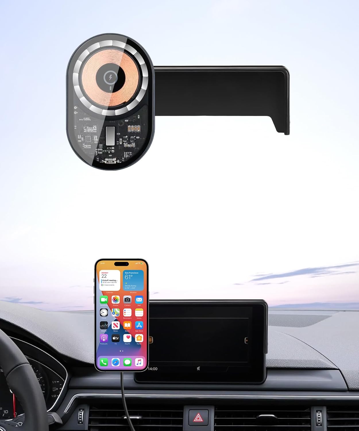 1. Instalação: Fixe o suporte na tela de controle central do seu Audi, garantindo que esteja bem preso e alinhado.