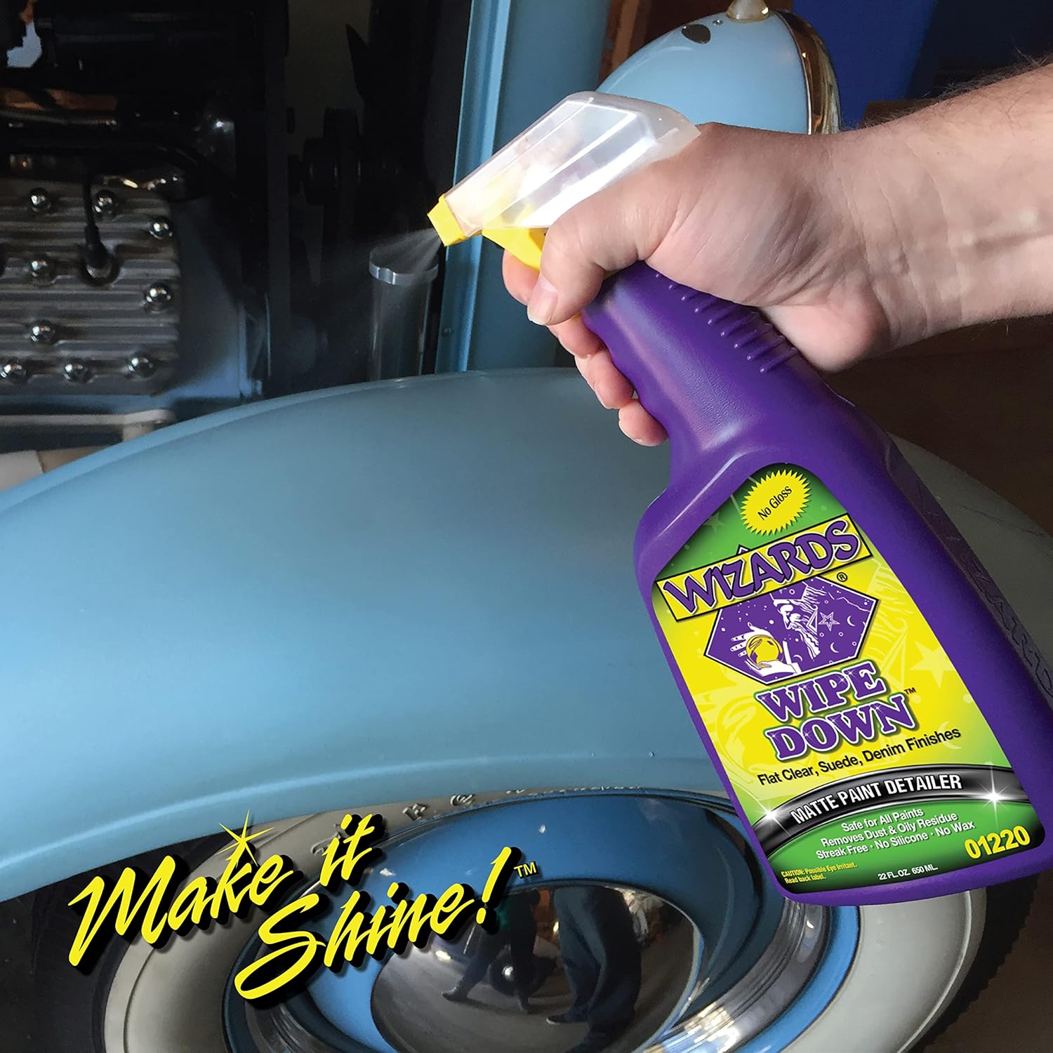 O *Wizards Wipe Down Spray* é seguro para todos os acabamentos foscos, como camurça, denim, primer acetinado e revestimento em pó fosco, garantindo que não haja marcas brilhantes ou manchas de água. Sua aplicação é simples e pode ser feita à mão ou com uma máquina de polir, tornando-o uma adição versátil a qualquer kit de limpeza ou detalhamento automotivo. Ele remove rapidamente manchas, impressões digitais oleosas e poeira de várias superfícies foscas.