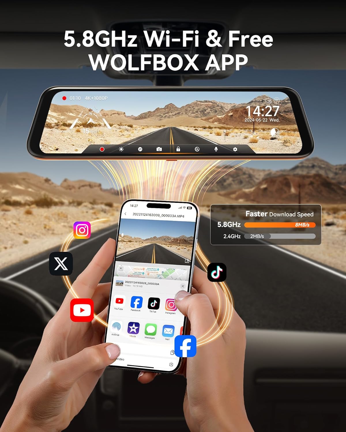 Câmera de Retrovisor WOLFBOX G850 12″ 4K com WiFi 5.8GHz e Controle por Voz – Dash Cam Frontal e Traseira, Câmera de Ré 1080P, WDR