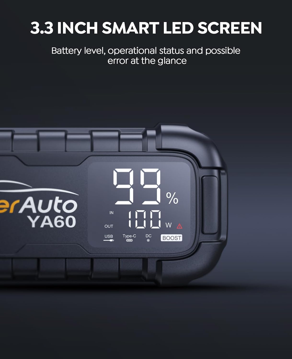 A segurança é uma prioridade com o YaberAuto, que conta com 10 tipos de proteções inteligentes e cabos jumper de 8AWG, garantindo que você esteja livre de preocupações com curtos-circuitos ou faíscas. O display inteligente de 3,3 polegadas permite que você monitore o status operacional, o nível da bateria e possíveis operações incorretas em tempo real.