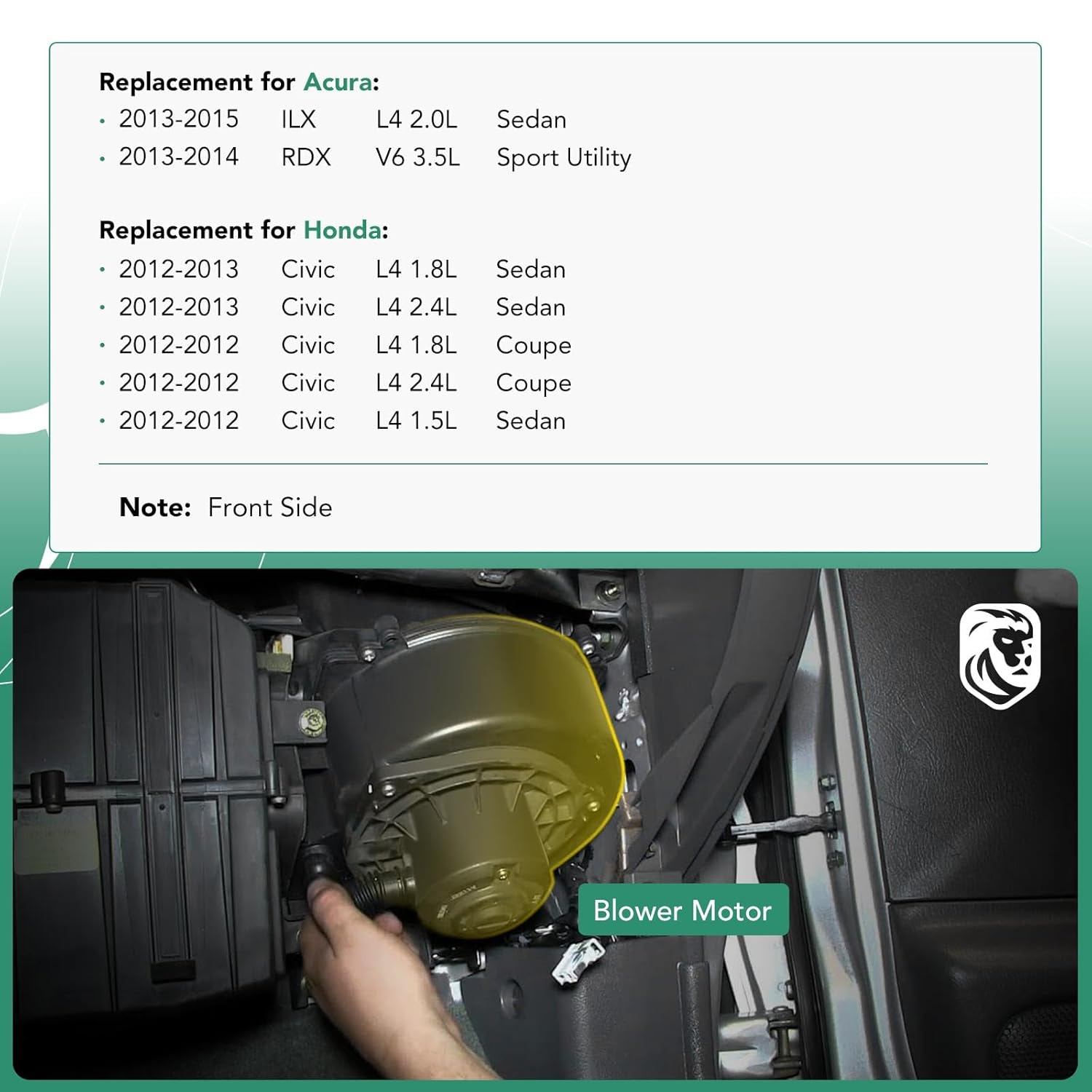 O YHTAUTO A/C Blower Motor Assembly é a solução ideal para quem busca um desempenho superior e confiabilidade em sistemas de climatização automotiva. Compatível com modelos específicos da Honda e Acura, este motor de ventilador é projetado para se encaixar perfeitamente em veículos como o Honda Civic (2012-2013) e o Acura RDX e ILX (2013-2015). Com um design que garante uma instalação direta, o YHTAUTO oferece uma alternativa acessível e de alta qualidade para a substituição do motor de ventilador original.