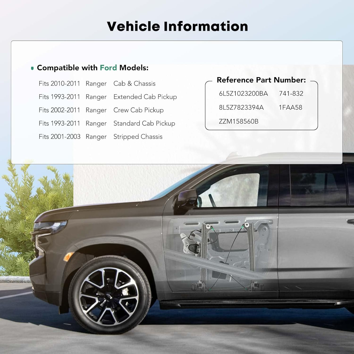 – Ajuste Perfeito: Este regulador é compatível com diversas versões da Ford Ranger, incluindo o modelo 2010-2011 Cab & Chassis, Ranger 2002-2011 Crew Cab Pickup, Ranger 1993-2011 Extended/Standard Cab Pickup e Ranger 2001-2003 Stripped Chassis, garantindo um encaixe preciso e funcional.