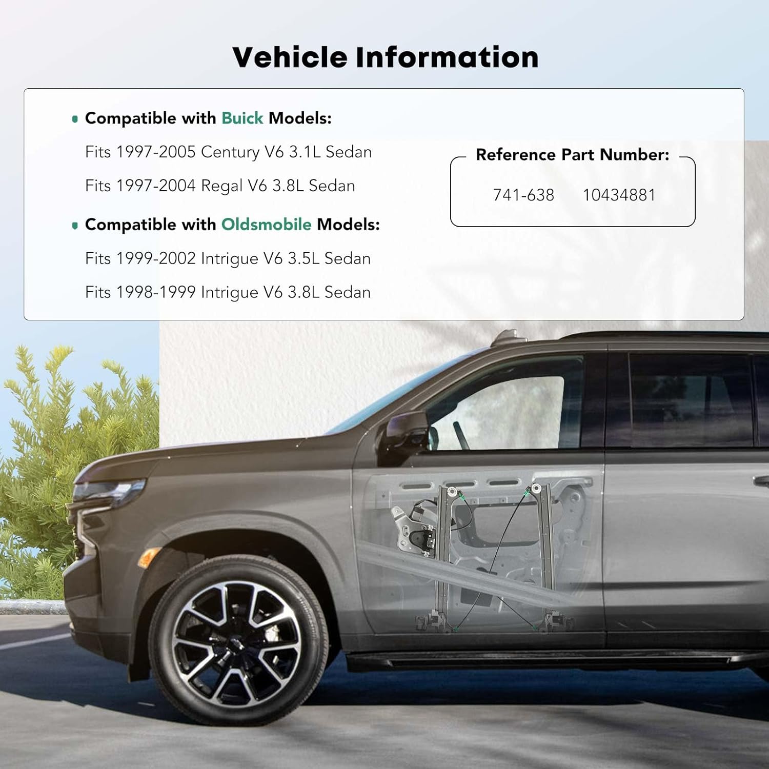 Este regulador e motor de janela são compatíveis com os sedãs Buick Century (1997-2005) e Regal (1997-2004), além de serem adequados para o Oldsmobile Intrigue (1998-2002). A compatibilidade precisa assegura que você não terá problemas na instalação e operação.
