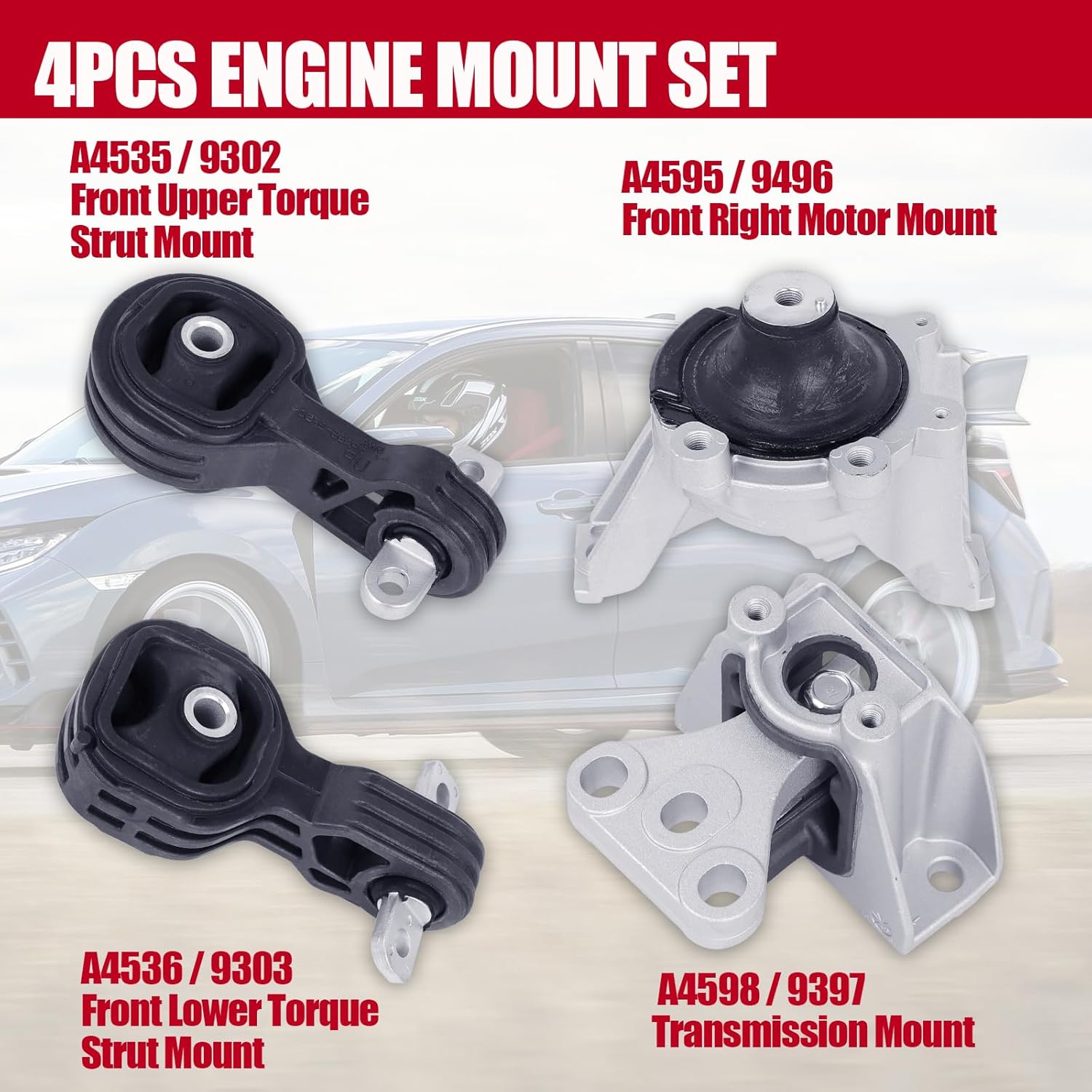 All 4 mounts fit a 2004 Honda Element with automatic transmission perfectly! I highly recommend and you cannot beat the price!