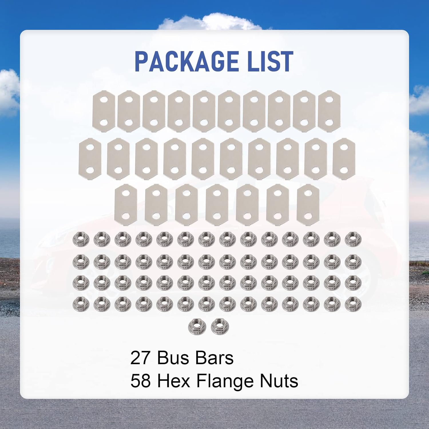 O conjunto inclui 27 barras de conexão e 58 porcas hexagonais com flange, todas projetadas para oferecer uma instalação segura e duradoura. As porcas de flange em aço inoxidável ASTM-304 são uma escolha excelente para ambientes abrasivos, devido às suas propriedades metalúrgicas superiores. O design da superfície serrilhada das porcas proporciona uma aderência excepcional, prevenindo o afrouxamento causado por vibrações, o que é crucial para a manutenção da integridade do sistema elétrico do veículo.