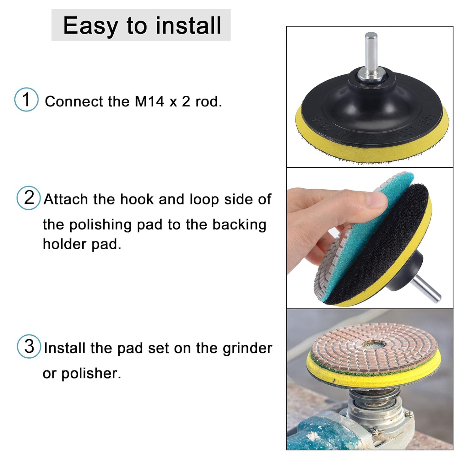 Os pads de polimento são acompanhados de um suporte de fixação com rosca fêmea M14 e uma barra de conexão com rosca macho M14, facilitando a instalação e a troca rápida dos pads. O design do suporte é otimizado com velcro de nylon, que garante uma aderência firme e a possibilidade de reposicionar os pads com facilidade. Essa característica é especialmente útil para profissionais que necessitam de agilidade em seus trabalhos.