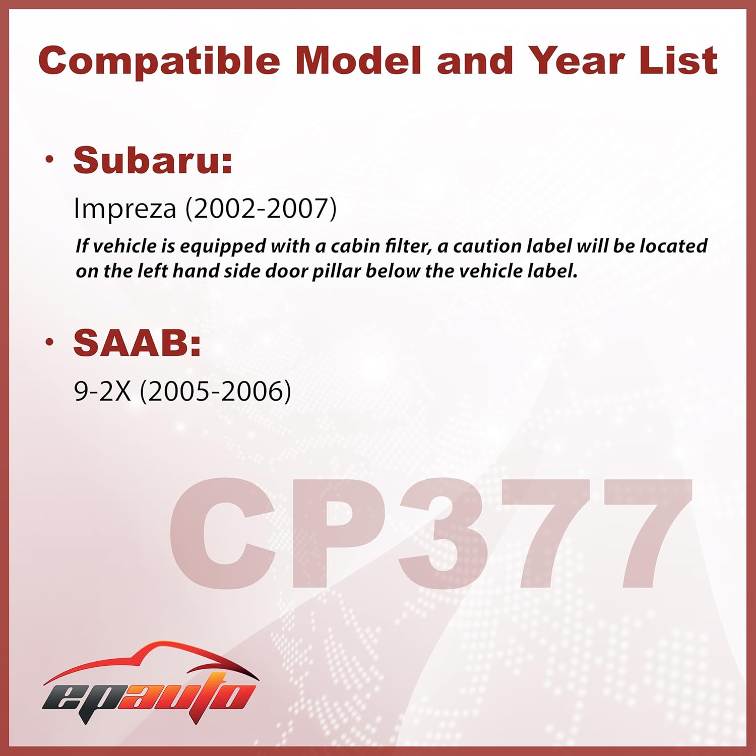 O Filtro de Ar do Cabine EPAuto CP377 (CF10377) é a escolha ideal para quem busca qualidade e eficiência na filtragem do ar dentro do veículo. Compatível com modelos Subaru Impreza de 2002 a 2007 e Saab 9-2X de 2005 a 2006, este filtro é projetado para substituir as peças genuínas Subaru, como o número de peça 72880-FE000, 32008082, 63210-FE100, G3210-FE100 e G3210-FE000.
