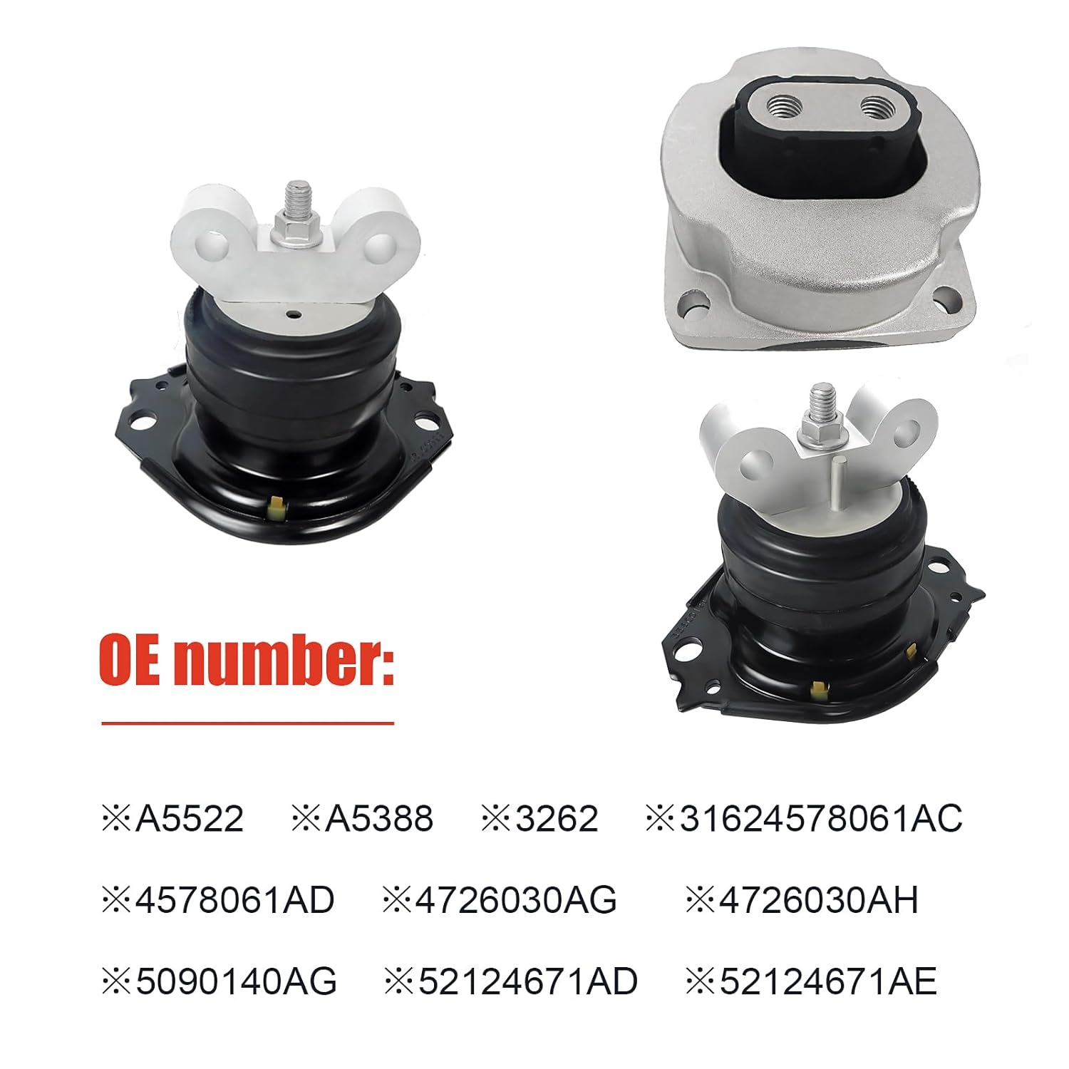 A Montagem do Motor é um componente essencial para garantir o desempenho ideal do seu veículo. Este kit inclui 2 montagens frontais do motor (A5522) e 1 montagem de transmissão (A5388), projetadas para atender a uma variedade de modelos Chrysler e Dodge, incluindo o Chrysler 300 (2011-2022) e o Dodge Challenger (2011-2022). Com números de peça como A5522, A5388, 3262, 3163, EM-4150, entre outros, este produto é compatível com motores V6 3.6L e V8 5.7L, tanto em configurações AWD quanto RWD.