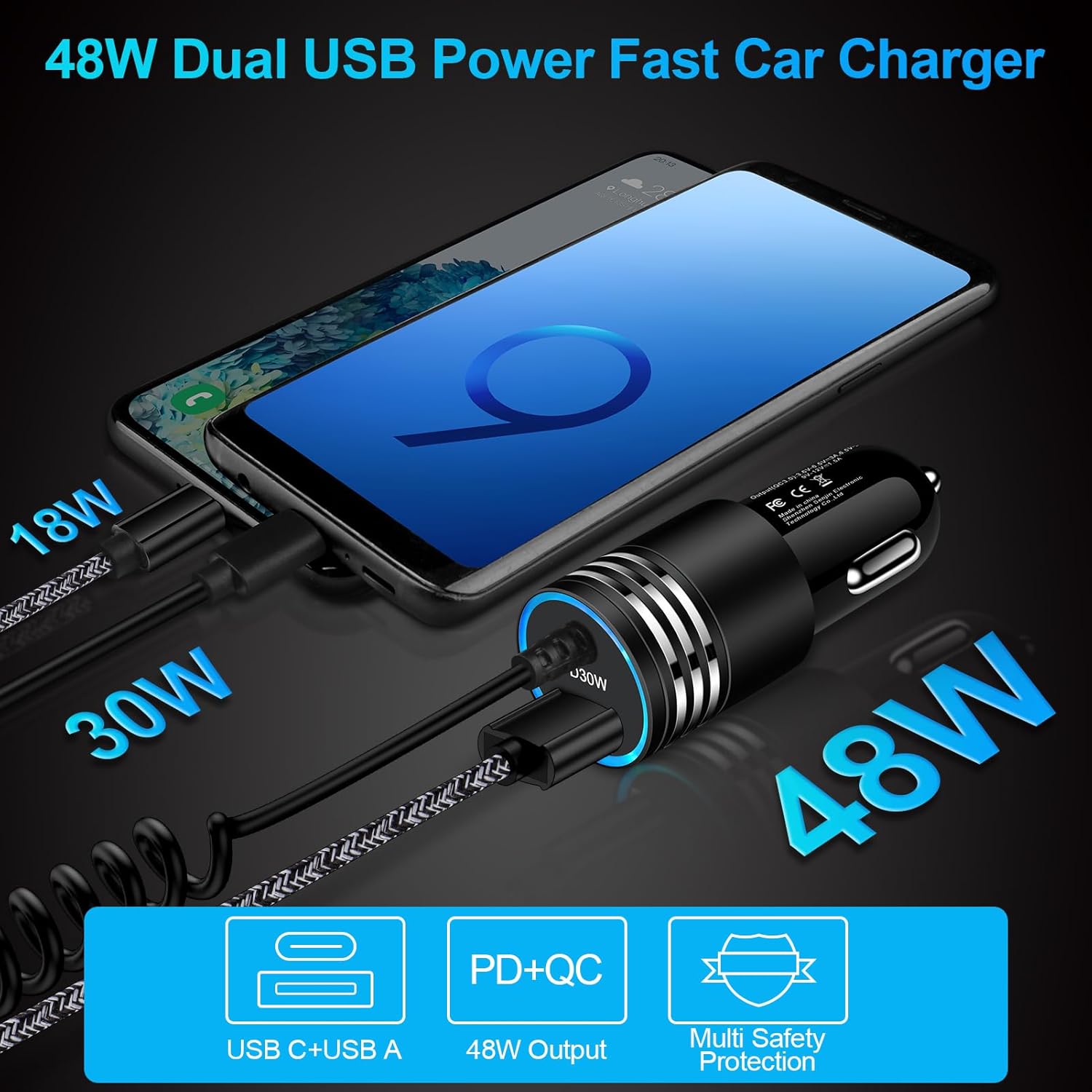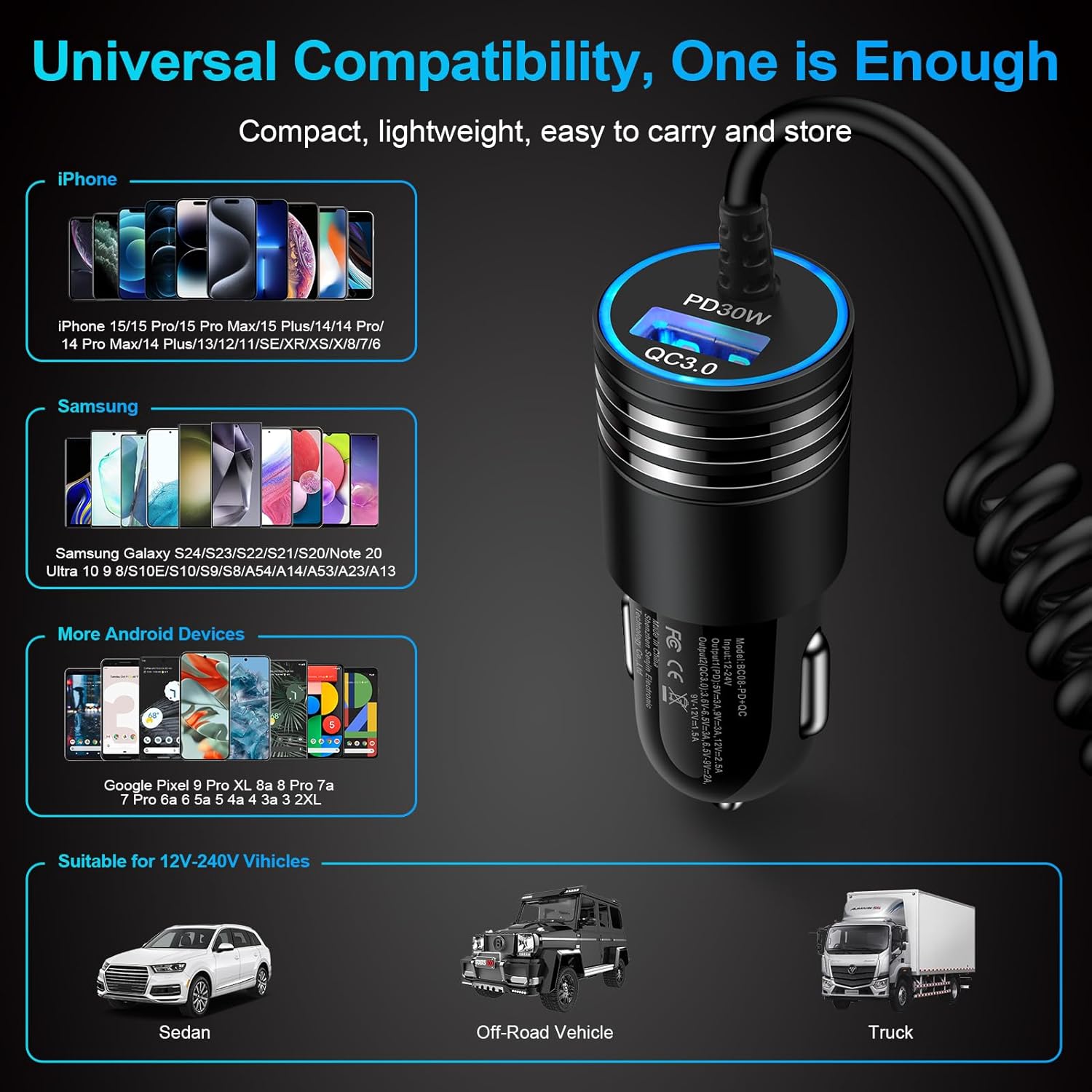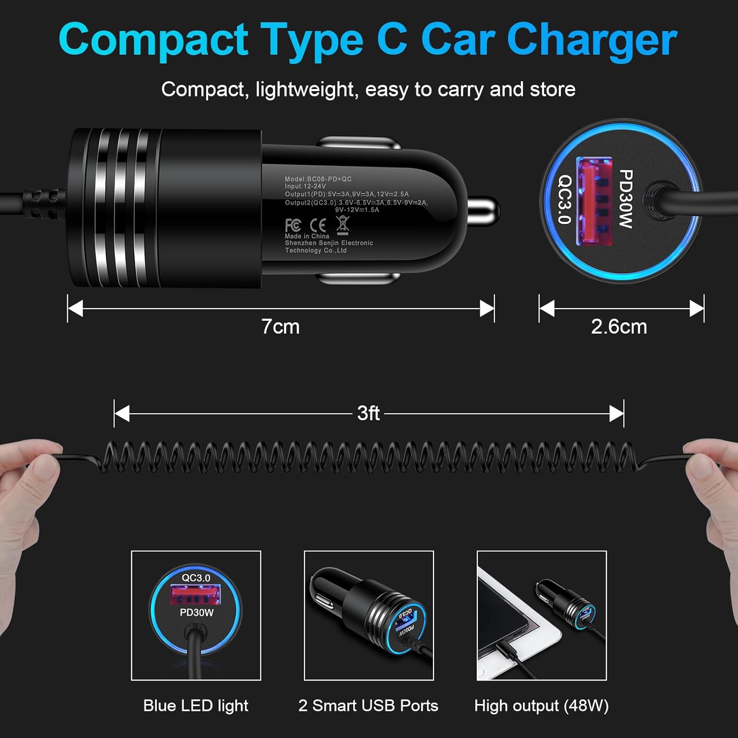 – O que Você Recebe: O pacote inclui um Carregador Rápido USB C de 48W com cabo tipo C retrátil de 3 pés. O design compacto se adapta perfeitamente à maioria dos soquetes de isqueiro de carro, sendo compatível com veículos de 12V/24V, SUVs, caminhões e quase todos os tipos de veículos.