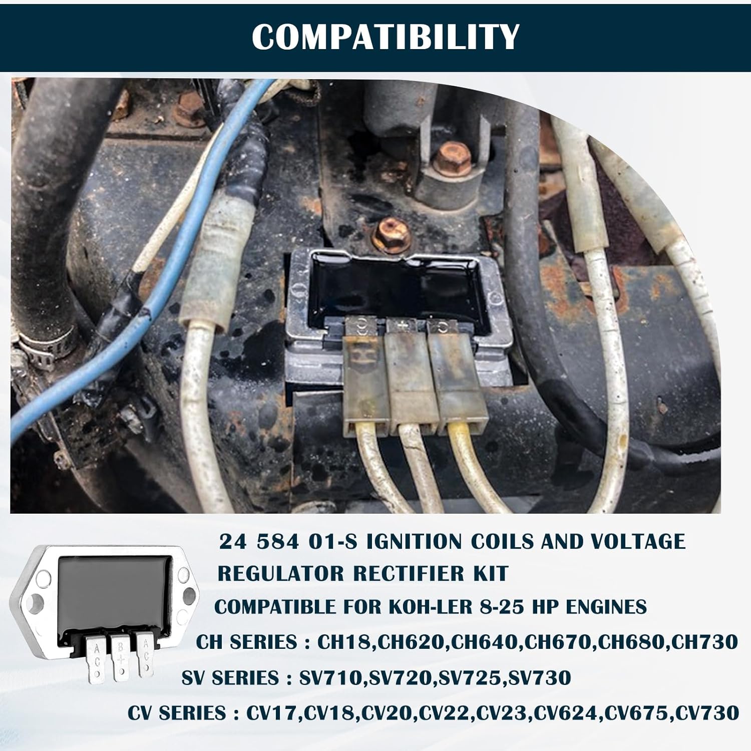 A combinação de 2Pcs 24 584 01-S Ignition Coils e o Regulador Retificador de Tensão é a solução ideal para quem busca otimizar o desempenho de motores Kohler. Compatível com uma ampla gama de motores, incluindo os modelos CH (CH18, CH20, CH620, CH640, CH670, CH680, CH730), CV (CV17, CV18, CV20, CV22, CV23, CV624, CV675, CV730) e SV (SV710, SV720, SV725, SV730), este kit garante que a ignição funcione de maneira suave, melhorando a performance do motor.