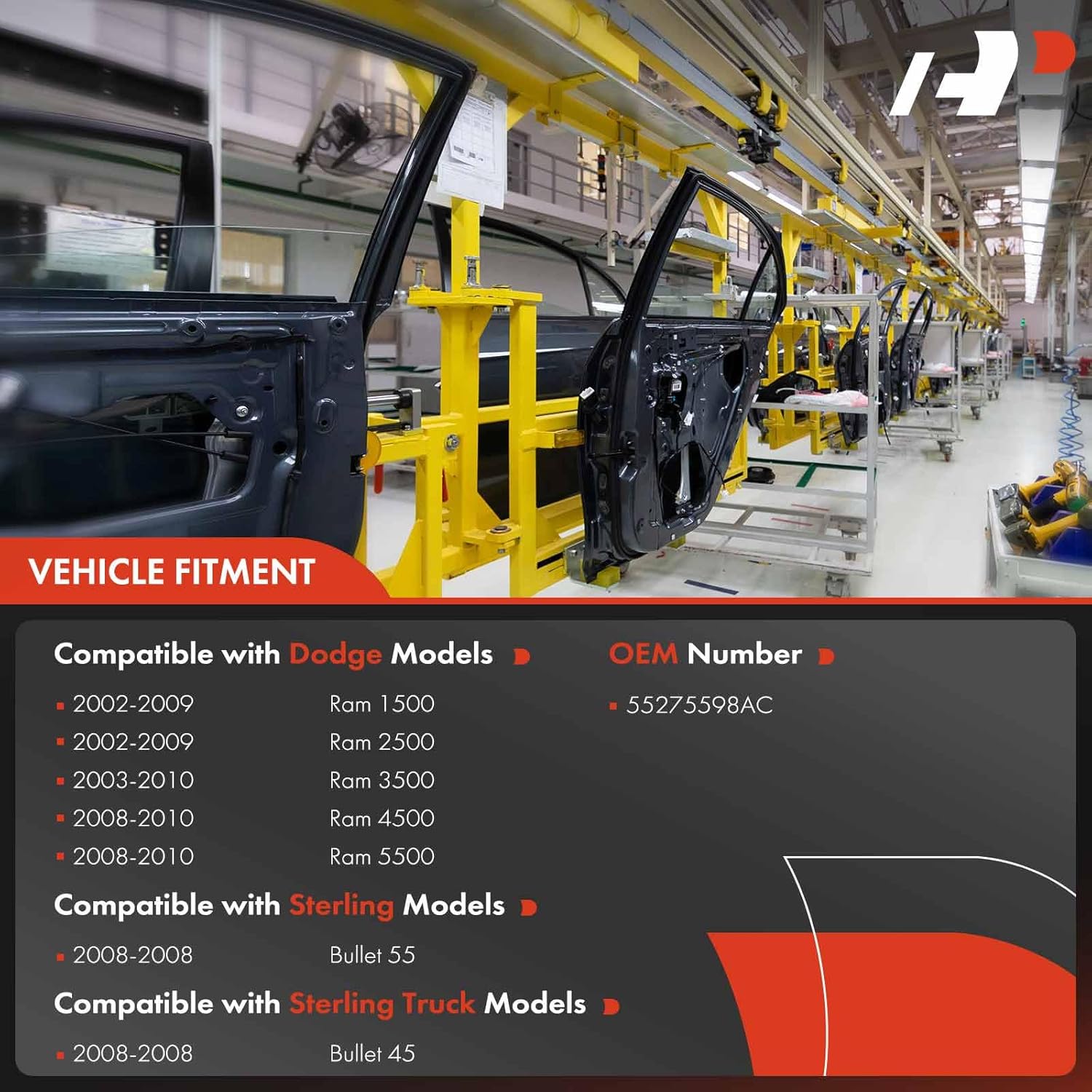 – Compatibilidade: Projetado para Dodge Ram 1500 (2002-2009), Ram 2500 (2003-2009), Ram 3500 (2003-2010), Ram 4500/Ram 5500 (2008-2010) e Sterling Truck Bullet 45 (2008).